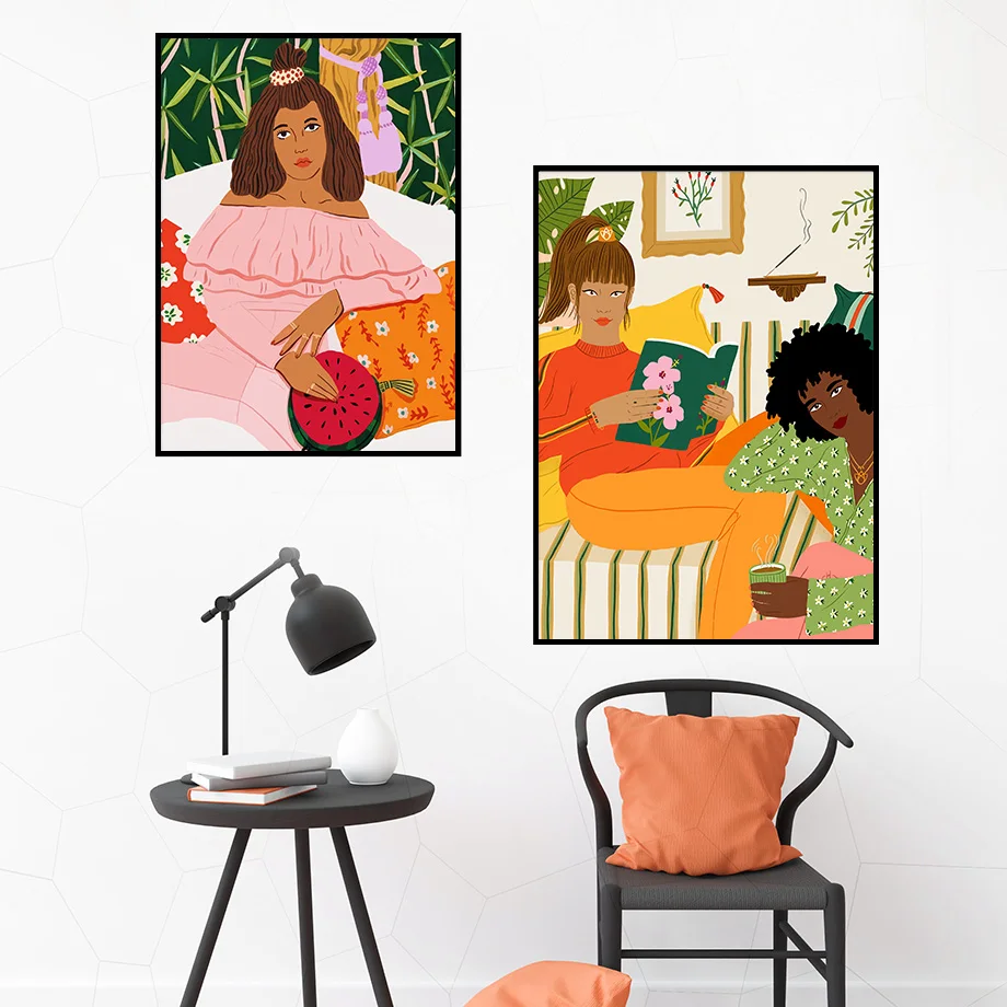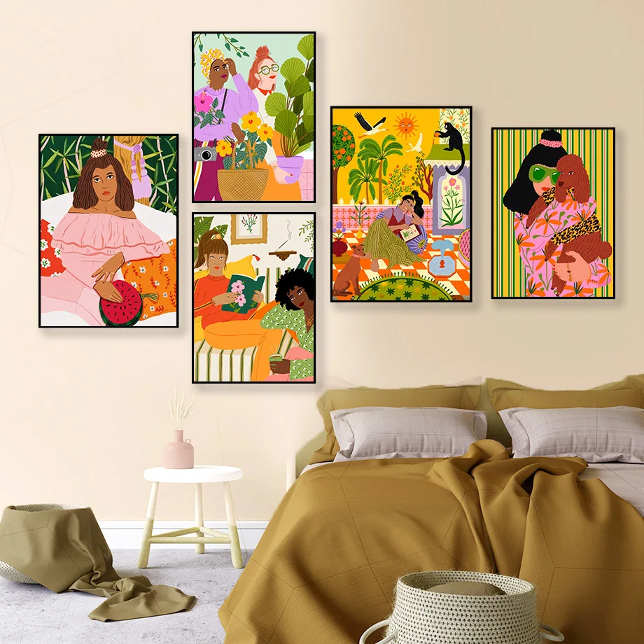 Винтажная абстрактная цветная Картина на холсте с изображением девушки собаки цветка скандинавские постеры и принты настенные картины для декора гостиной