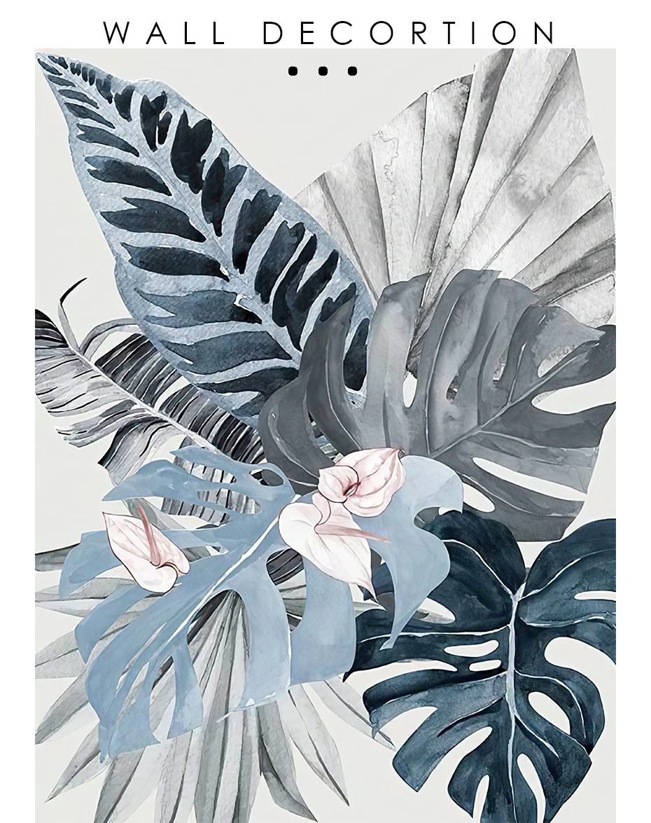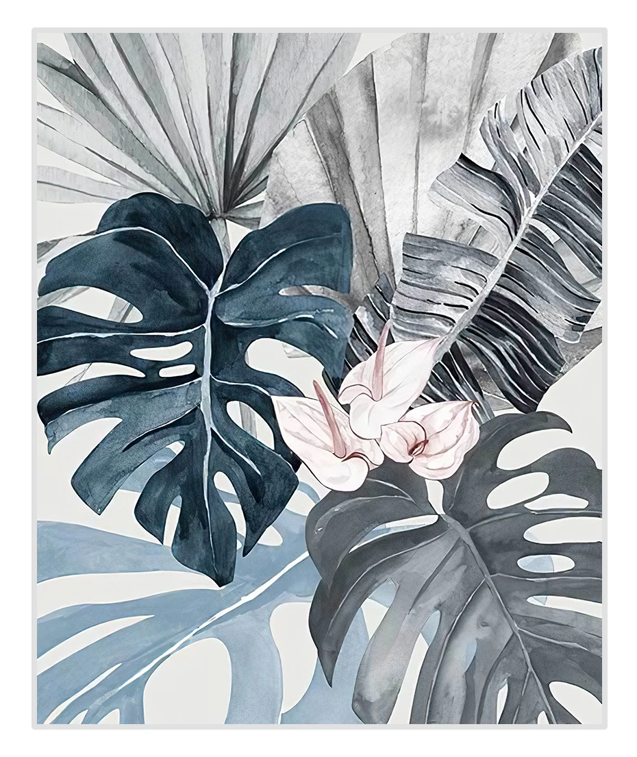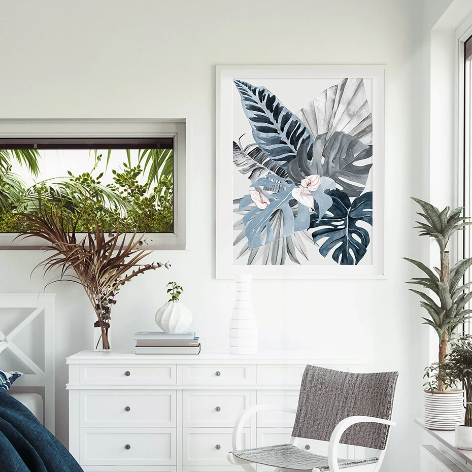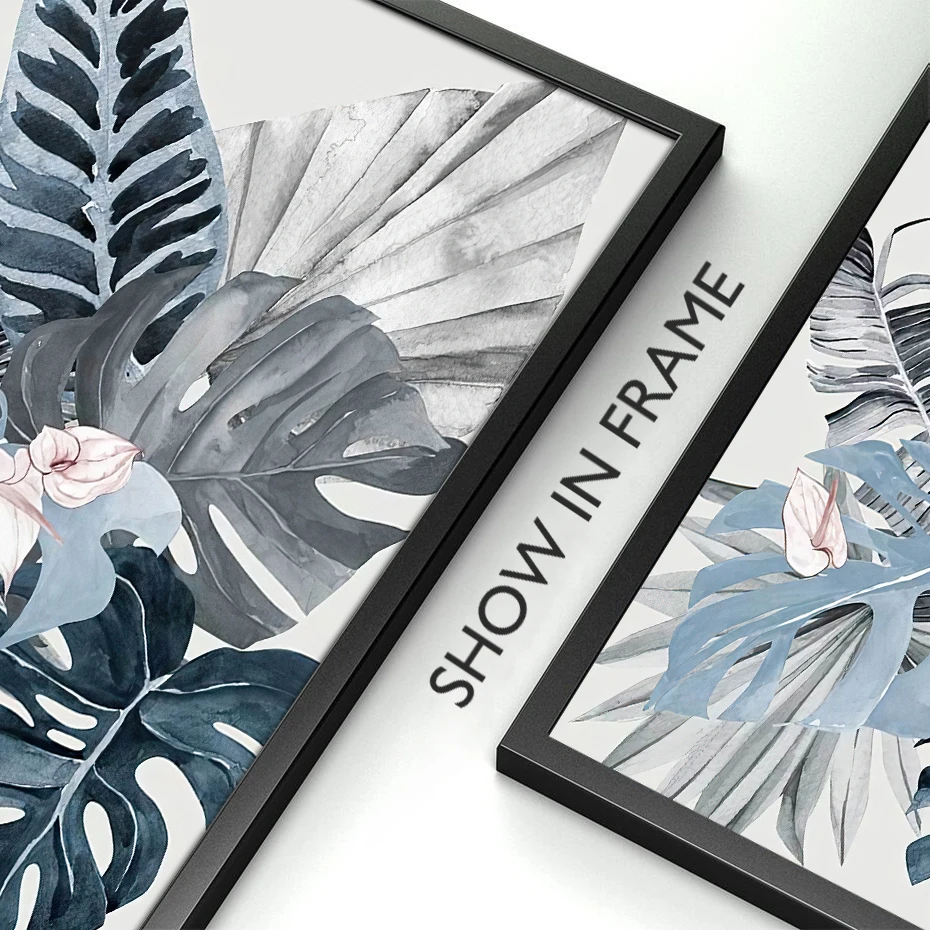 Акварельная тропические растения и листья, синяя Картина на холсте, настенные художественные плакаты, печатная картина для гостиной, спальни, украшение для дома