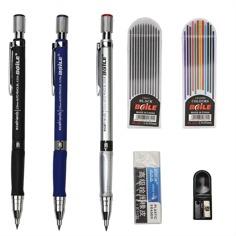 Карандаш механический, толщина 2,0, 12 цветов, 2B черный карандашный свинец