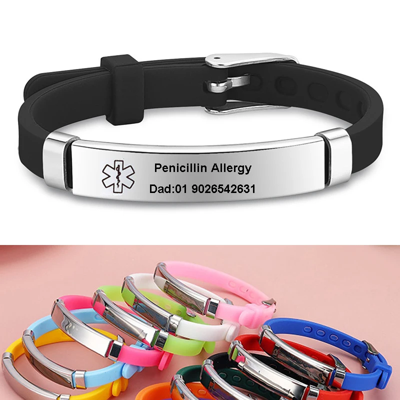 Браслеты для мальчиков и девочек, персонализированные украшения с гравировкой под заказ, с медицинским оповещением, Детские Силиконовые регулируемые браслеты с SOS
