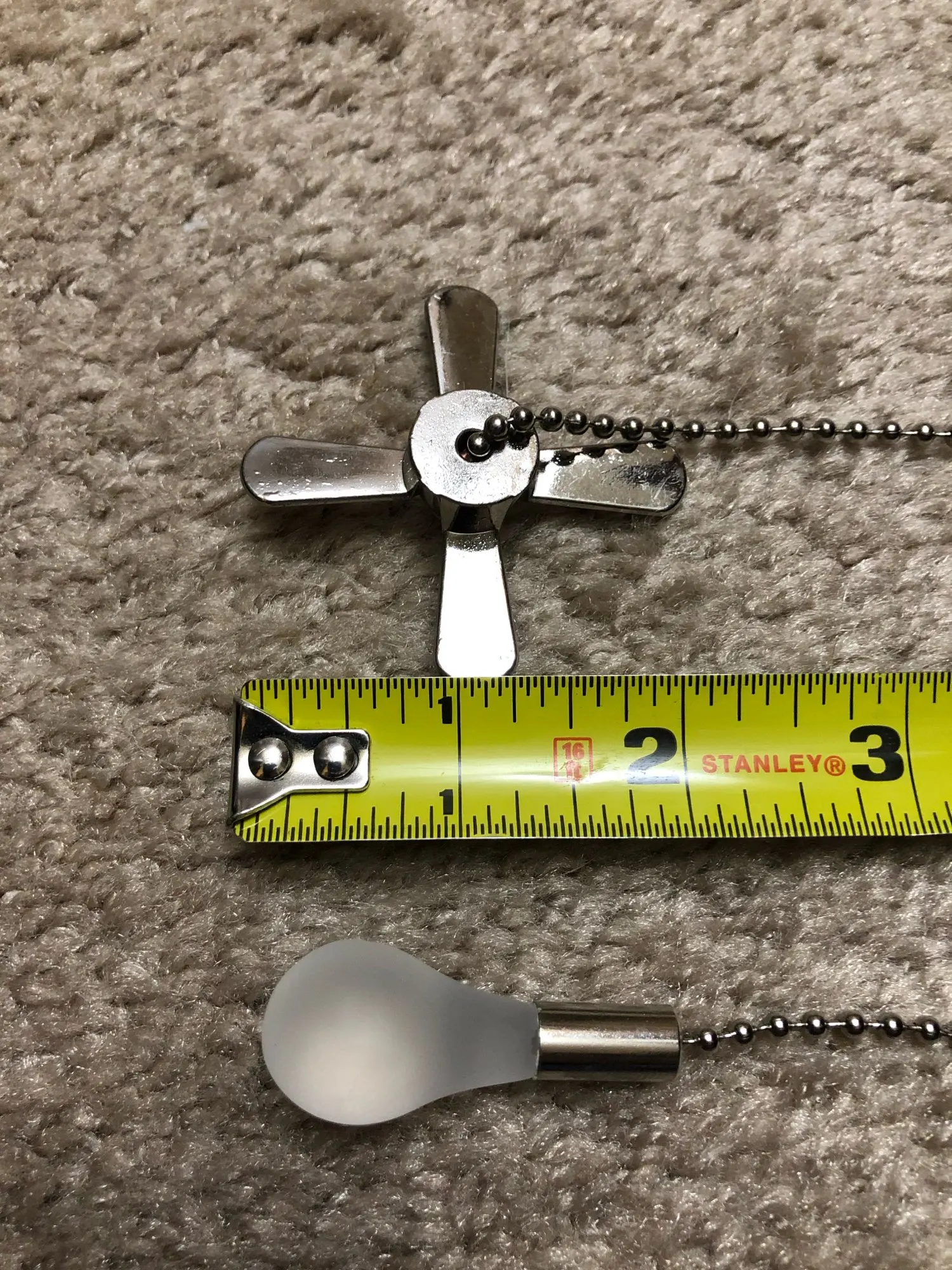 12/17 заказал и пришел в США 1/19. Доставка во время, но я думаю, что это не так. Предметы выглядят мило, но веер имеет дефекты. Каждая цепь 12 ”. Часть вентилятора составляет 2 ”и лампочка составляет 1,75” покрытие немного дешевле из-за пятен. В любом случае, я уверен, что со временем будет нормально носить и разрывать (например, царапины по почте или что-то другое). В целом, я доволен этой покупкой, но для большего количества новизны/милых факторов.