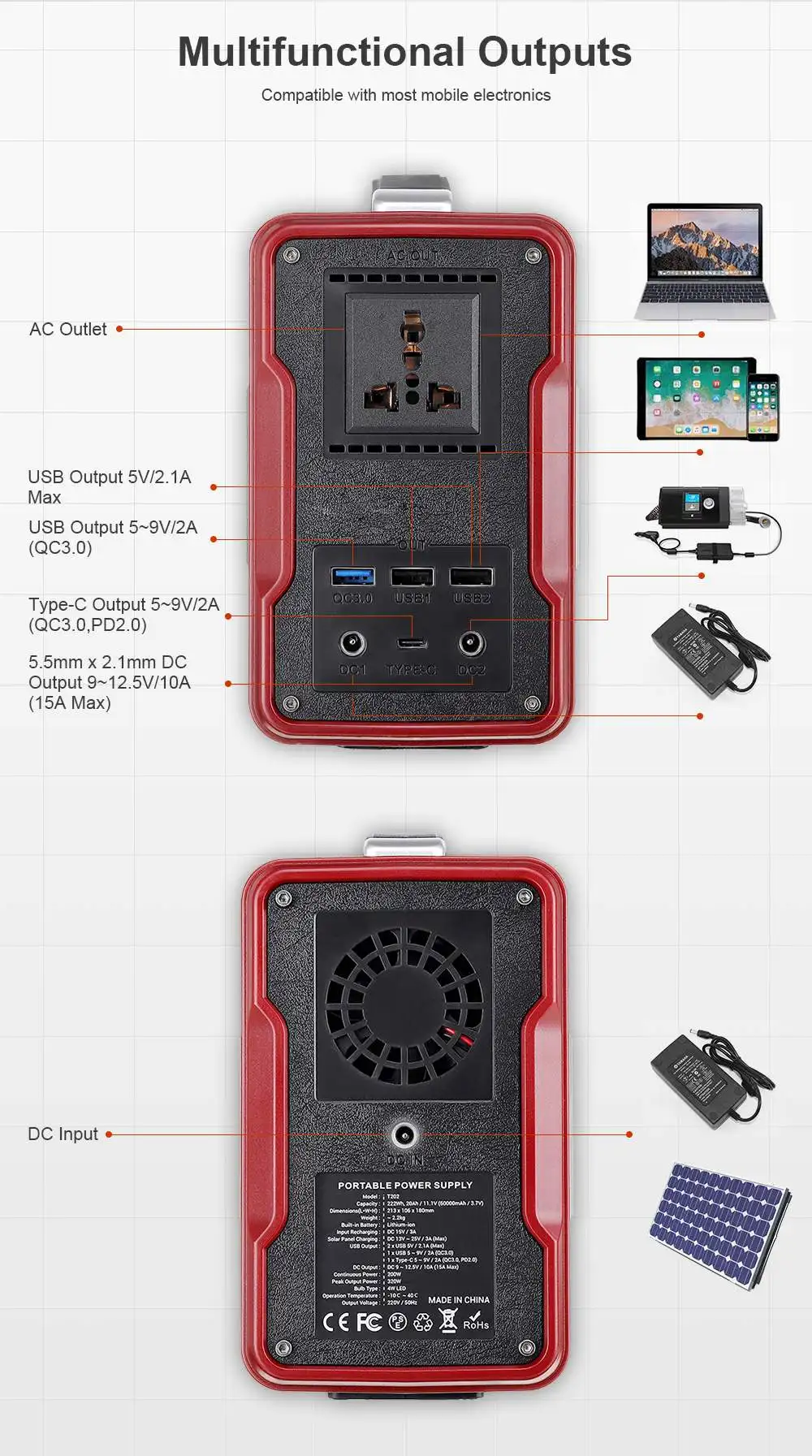 Особенности:-222Wh, большая емкость 60000mAh-Стабильная выходная мощность переменного тока 300 Вт, пиковая мощность 320 Вт-3 выхода USB 1 выход Type-C с QC3.0 PD2.0-2*120 Вт DC выход-Оснащен аварийными огнями-Защита от перегрузки, защита от падения-Удобный ручной захват-Совместимость со всеми типами цифровых продуктов на открытом воздухе, такими как ноутбуки, мини-Кулеры, дроны
