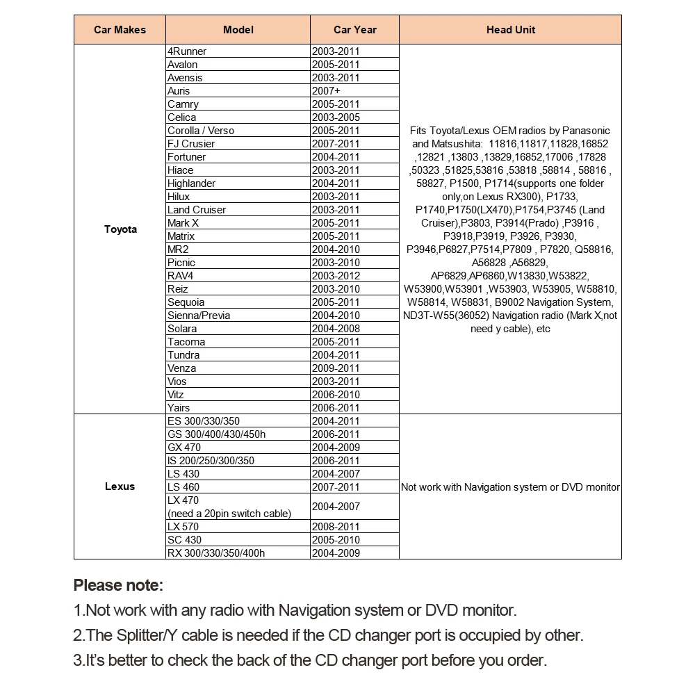 52867(Vios), Aygo, 58805 (2003 RAV4), 56018, 58813,T18303,B9010, B9004 (2007 RAV4),RAV4 с заводской навигацией, TNS Travel 700, P1718, p3905, P6813,P6832,WH8403,W58816,T18303, W13807/W13081/W13086 (Auris),W53904(Panasonic,Avensis 2005-2007), W58832,36458, AD1812(Delphi on 2010-2011 Tundra/ Sequoia),AD6900(Delphi on 2000-2004 Avalon), другие радиостанции ADxxxx