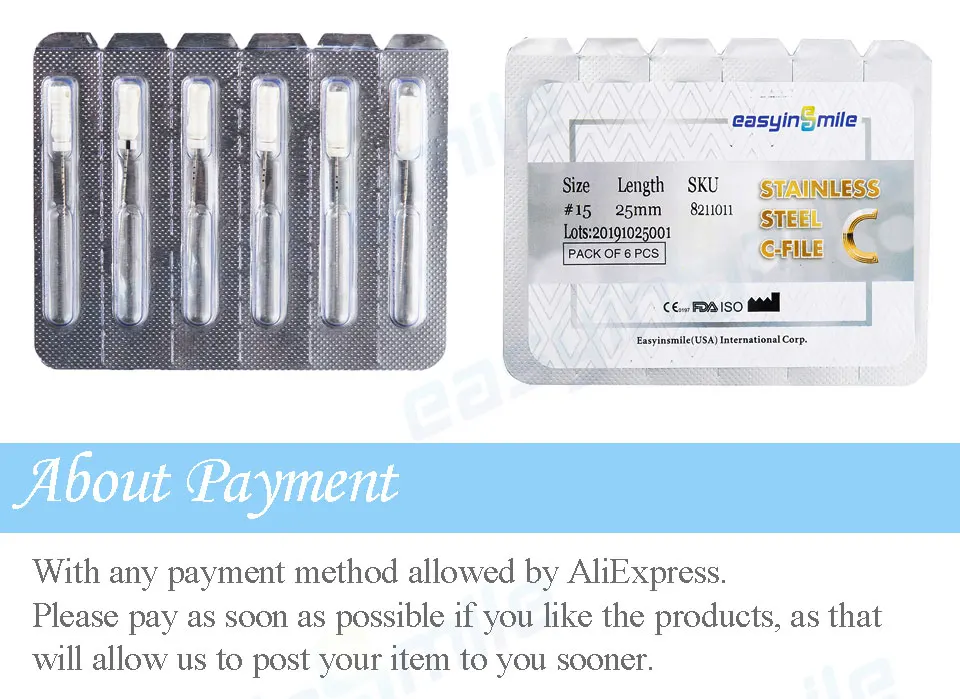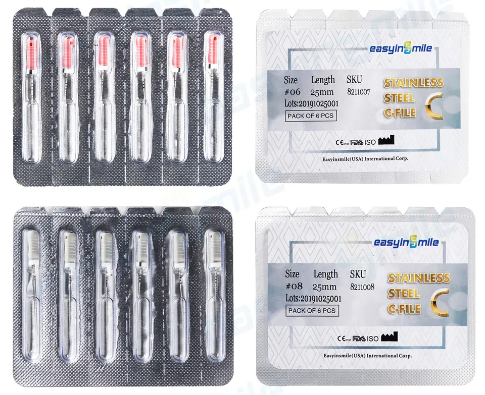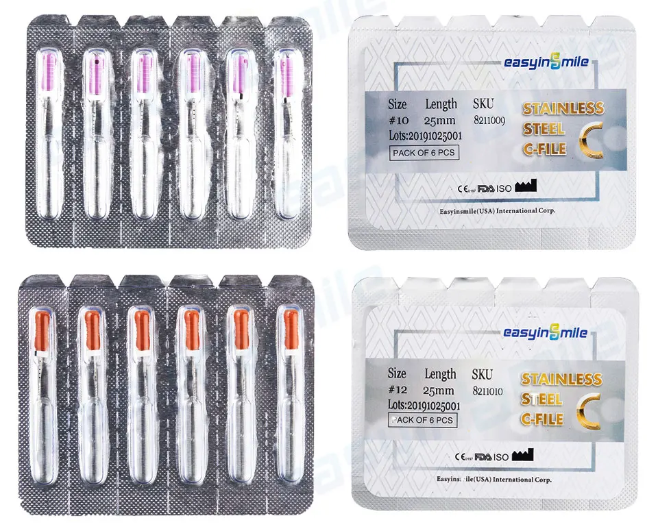 1. Бренд: EASYINSMILE2. Тип: файл C3. Материал: нержавеющая сталь4. Стерилизатор: предварительно стерилизованный5. Длина: 25 мм6. Доступные размеры: #6, #8, #10, #12, #15Особенности:1. Для сильно изогнутых или кальцифицированных корневых каналов.2. Специально разработан с повышенной прочностью на растяжение, что обеспечивает более легкое расположение, проникновение и начальное оборудование самого сложного или кальцифицированного канала.3. Обеспечивает создание плавного скользящего пути, ведущего к каждому вращению подготовки.4. Облегчает проникновение в сложные, кальцифицированные каналы.Посылка:6 шт./упак.,10 упаковок/посылка