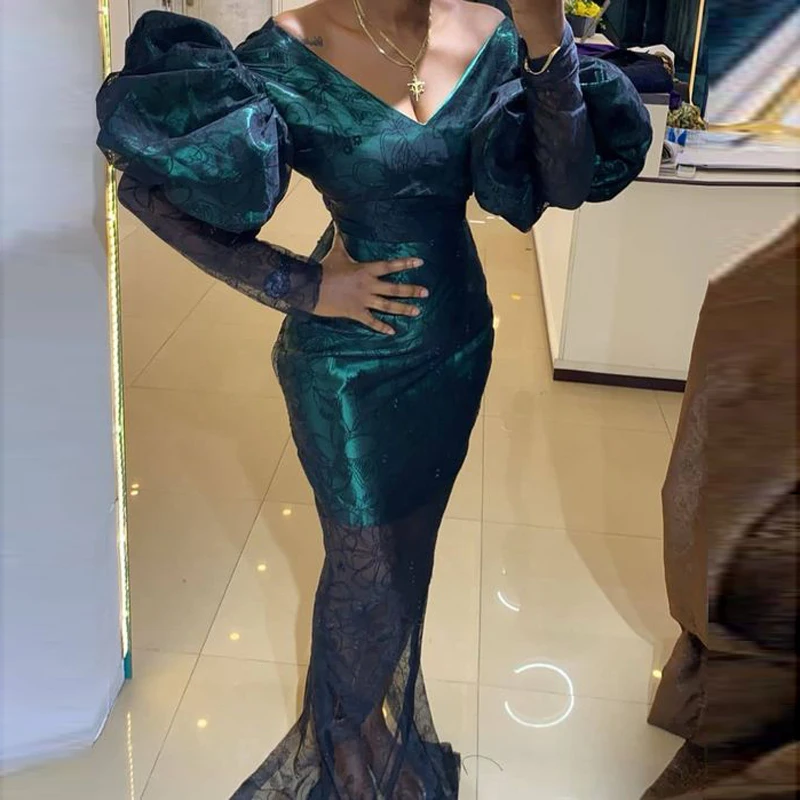 Вечернее платье-русалка, с пышными рукавами, V-образным вырезом, в африканском стиле, для выпускного вечера, размера плюс