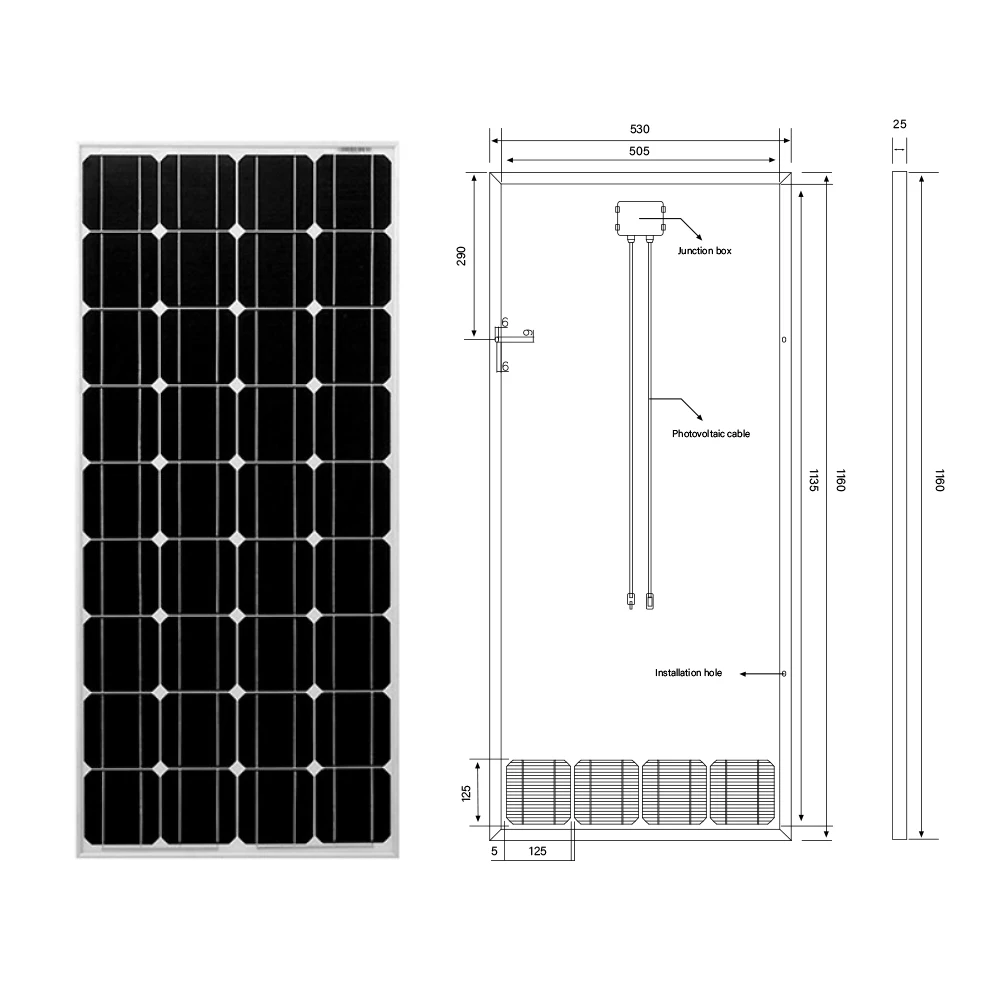 Номинальная мощность 100 ваттРабочее напряжение (Vmp) 18 напряжениеНапряжение открытой цепи (Voc) 21,6 напряжениеТок короткого замыкания (Isc) 6,06 АРабочий ток (Imp) 5.55AВыход погрешность ± 3%Максимальное напряжение системы 1000 В DC(IEC)/600 В DC (UL)Диод 2 ПассРаспределительная коробка IP 65 НоминальнаяДиапазон температур-40 градусов до 80 градусовРама из тяжелого и твердого алюминиевого сплаваВид стекла 3,2 мм закаленное стеклоВыходной кабель 2,5 мм 90 мм (0,09*3,54 дюйма)Размеры 1160*530*25 ммВес 6,5 кг