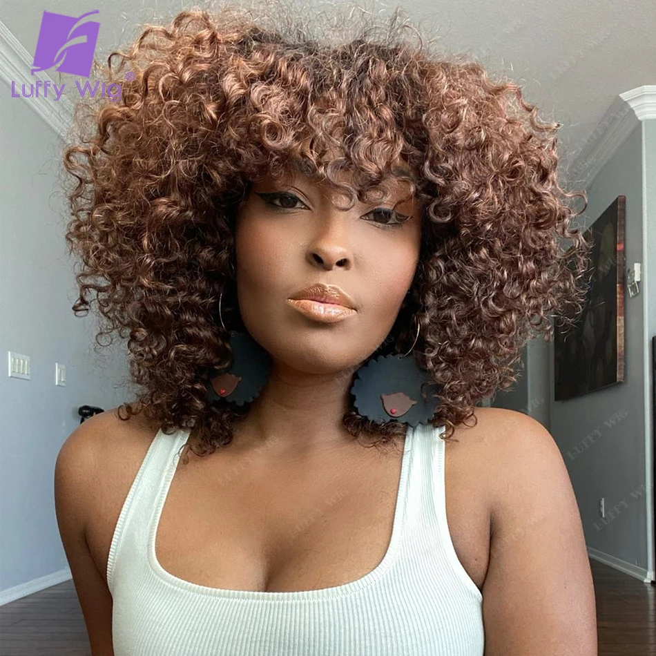 Парик из вьющихся человеческих волос с челкой, натуральные бразильские волосы без повреждения кутикулы, парик из человеческих волос, коричневые цветные парики LUFFY