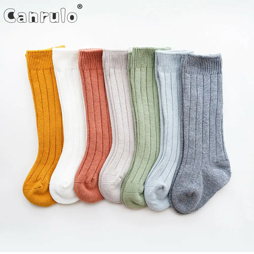 Осенне-зимние детские однотонные противоскользящие трикотажные хлопковые длинные чулки выше колена для маленьких девочек и мальчиков