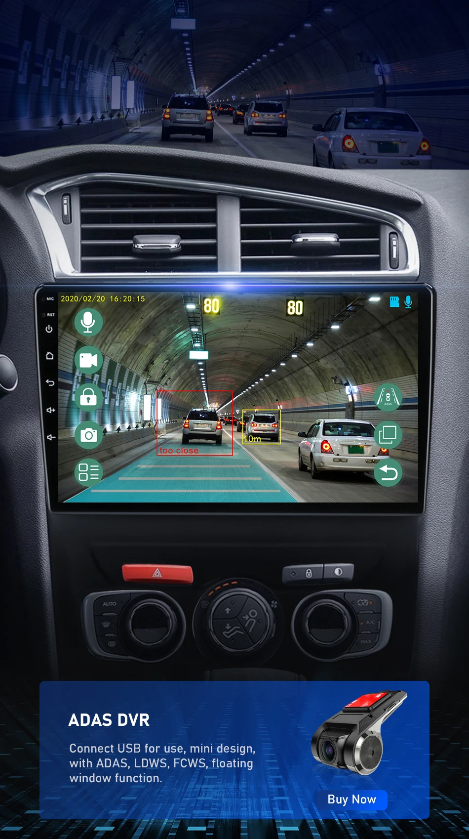 Поддерживает подключение к видеорегистраторУ ADAS. ADAS DVR имеет несколько встроенных ассистивных технологий вождения, вставляя высококачественную карту памяти TF для записи каждого момента вашего вождения.
