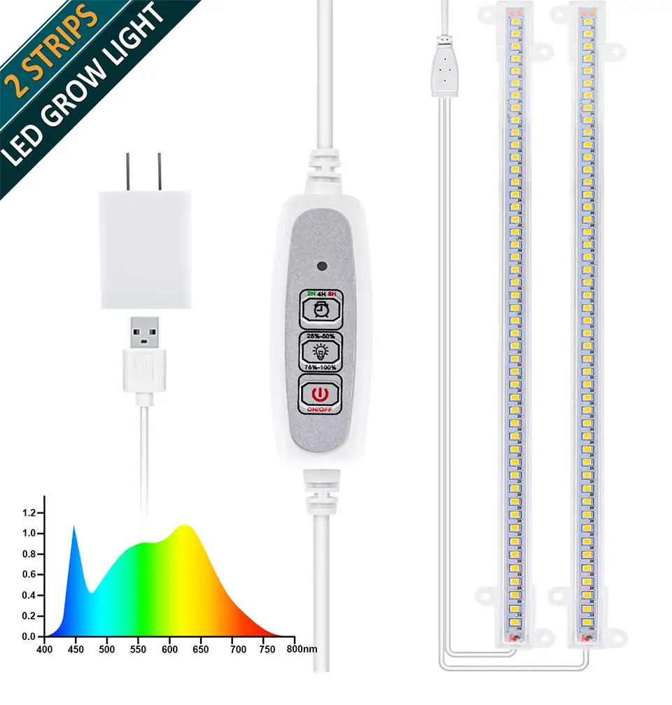 2 шт. светодиодный светильник для выращивания, полоски, полный спектр, таймер, теплый белый светодиодный светильник для растений, фитолампа, фитоламповая палатка с адаптером питания[Полный спектр светильник для выращивания]Этот растительный светильник излучает все длины волны светильник от 380нм до 800нм, как и естественный солнечный светильник. Было доказано, что он ускоряет Фотосинтез и эффективно способствует росту комнатных растений.[2H/ 4H/ 8H Таймер Автоматическое включение и выключение каждый день]Этот светодиодный светильник для выращивания может быть установлен для выключения после 2H/4H/8H. После установки времени, не выключайте светильник или не отключайте питание вручную, светильник включается автоматически одновременно на следующий день.[4 регулируемых уровня яркости]25%, 50%, 75%, 100% прочности. Две полосы 10 Вт и 48 Светодиодный светильник достаточно излучают, чтобы покрыть все этапы роста растений, не беспокоясь о выгорании растенийPlug And Play-светильник для выращивания поставляется с винтами и двусторонней лентой для легкой установки. Компактный дизайн подходит для различных приспособлений и поверхностей. Шнур питания длиной 71 дюйм для удобства использования в офисах, в помещении, на стойках растений, теплицах и т. д.Особенности:Высокая эффективность и энергосбережениеБезопасность и здоровье для ваших растенийБольшое покрытие для ваших растений, которым нужен достаточно светильник для выращиванияСделайте ваши растения более быстрыми и здоровымиМаксимальная температура: 140 ℉. Безвредный для ваших растенийМаксимальное расстояние между двумя лампами-светильник: 33 дюймаПодходит для суккулентов, цветов, семян, базилика, розмарина, нарциссов, плюмерии, алоэ, Орхидея, тимьяна, огурцов, помидоров, перцев и т. д.Спецификация:Светодиодная лента солнечного света: 10 Вт/барМатериал: ПВХЭквивалентная Мощность: 20 ВтВходное напряжение: 5 ВСветодиодный Кол-во чипов: 96 (48 Светодиодный чипов для каждого бара)Длина волны: 380-780 нм светильникСрок службы: 50000 часовСветильник бар: 13,2 дюйм (ов)Шнур питания: 71 дюймМногократное использование:Светодиодный светильник для выращивания растений в помещении используется для теплицы, садоводства, гидропоники или аквафонной посадки и внутреннего садоводства.Посылка включает в себя:1х растут огни для комнатных растений (2 полоски)1x USB адаптер питания1x Двусторонняя лентаВинты 8x1x Руководство пользователя
