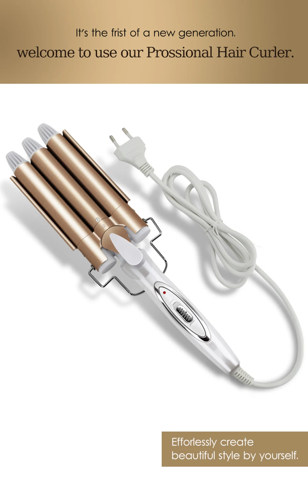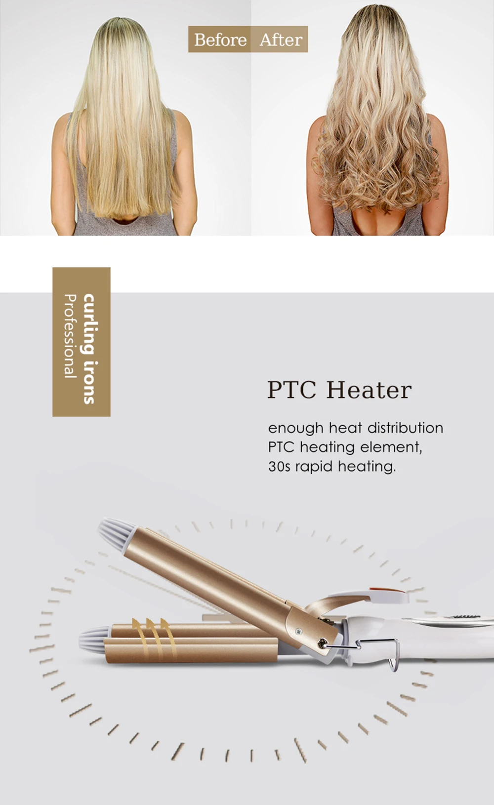 Материал теплопроводника: турмалиновая керамикаНапряжение: 110-220 ВЧастота: 50/60 ГцМощность: 45 ВтНагревательный элемент: PTC быстрый нагревКонтроль температуры: регулируемый 170 °C, 220 °CДлина кабеля: 1,7 м1 уникальный дизайн с 3 трубками2. Высококачественный нагреватель с функцией завивки обеспечивает бесподобное распределение тепла3 одного переключателя и 2 режима (170 ° C и 220 ° C), регулируемая температура4. Оборудование для быстрого нагрева