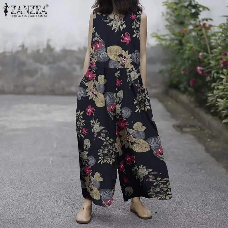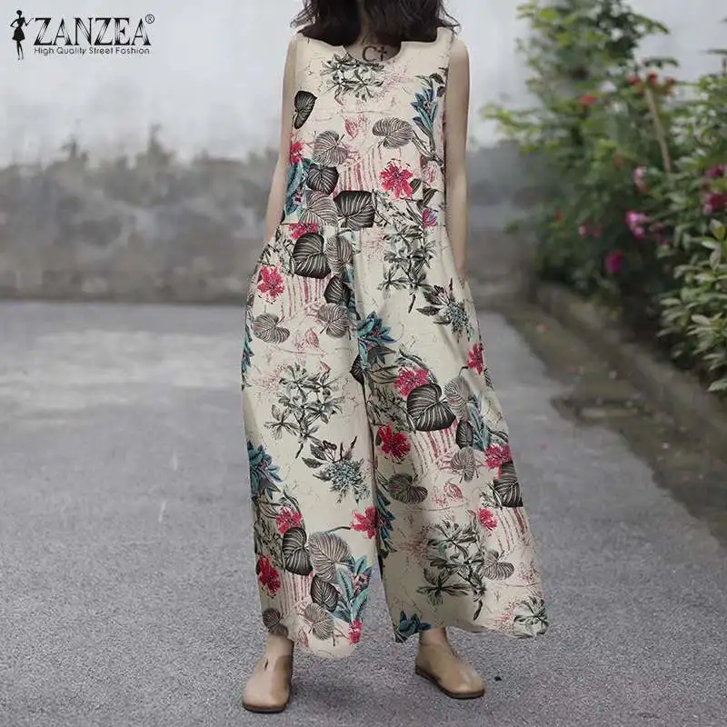 Женский комбинезон с цветочным принтом ZANZEA, Летний комбинезон с широкими штанинами, повседневный комбинезон в стиле ретро, 2021