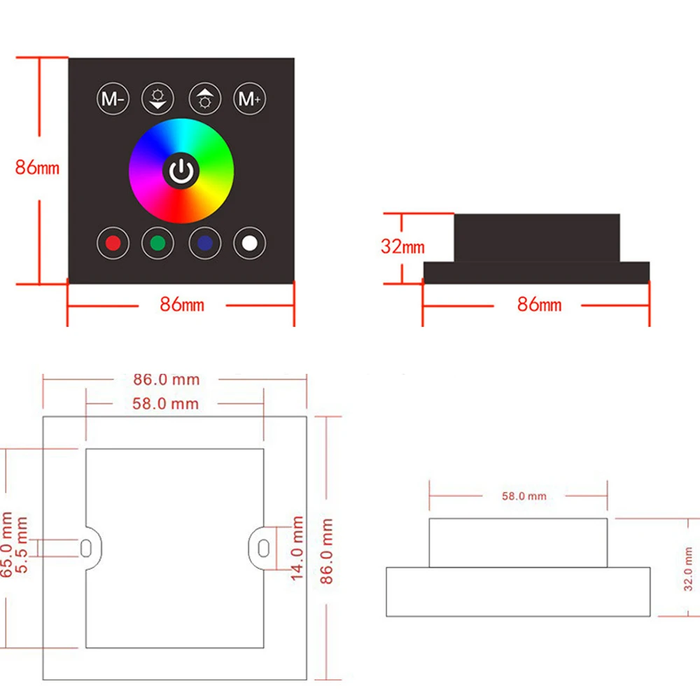 Метод двойного управления: Сенсорная панель или сенсорный пульт дистанционного управления Материал: стеклянная панель + АБС-пластик Входное напряжение: DC12-24V Выходное напряжение: DC12-24V Выходная мощность: Макс. 288 Вт (12 В постоянного тока) / 576 Вт (24 В постоянного тока), 6 каналов ax4 Цвет: черный Расстояние дистанционного управления: 15-20 метров Рабочая температура: - 20-60 ℃ Класс водонепроницаемости: IP65 Размер пульта дистанционного управления: 86*86*32 мм Ручной сенсорный пульт дистанционного управления Размер: 113*55*20 мм Подходит для: светодиодной ленты RGB/RGBW