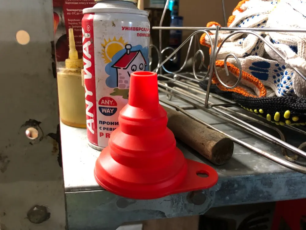 Отличная штука, чтобы доливать незамерзайку или моторное масло (для каждой жидкости нужно иметь отдельную). По размеру очень маленькая, примерно с пол ладони.