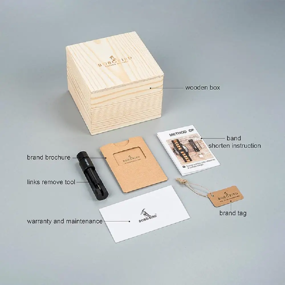1 * деревянные часы 1 * деревянная коробка 1 * инструмент для удаления звеньев 1 * Фирменная брошюра 1 * Инструкция по укорачиванию ремешка 1 * Фирменная бирка 1 * Гарантия и техническое обслуживание (Гарантия: 1 год)