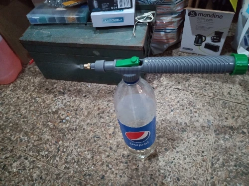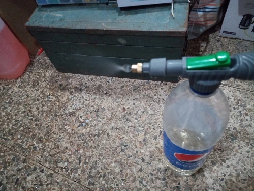 Насос приходит, резиновая прокладка. Насос смазан жиром, а грязь воды регулирует форму струи, поворачивая наконечник. В качестве контейнера для воды Используйте бутылку известной подачи клея, потому что это нить, которая подходит, те из бутылок с водой обычно не стоят, потому что они больше. Когда я попробую, я прокомментирую выход воды и работу в целом.