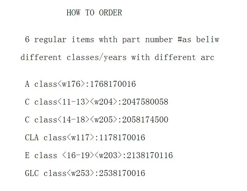 Примечание: у нас есть 6 постоянных товаров с номером # как показано ниже, пожалуйста, проверьте оригинальный номер на вашем автомобиле и выберите правильный, чтобы сделать заказ, различные классы и разные годы разнообразны по дуге. До сих пор у нас только 5 товаров: