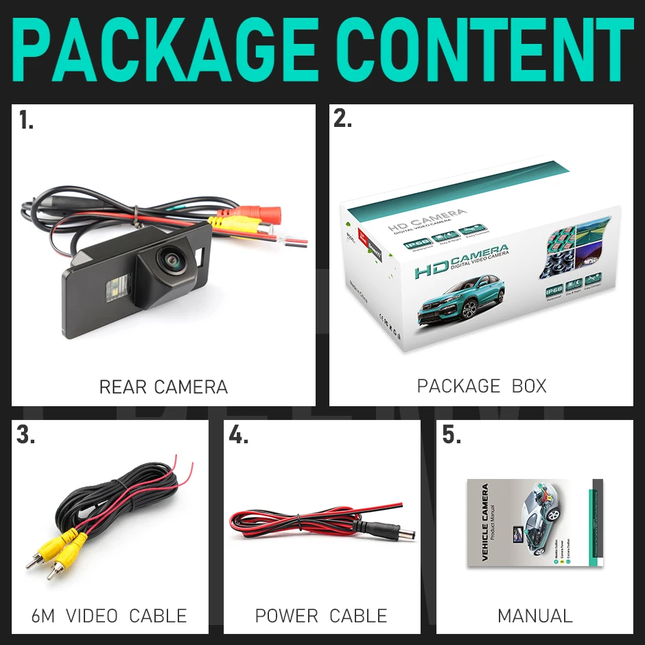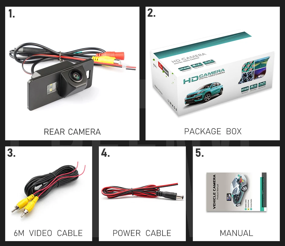1. Задняя камера2. Коробка для посылка3. Видео кабель (6 м)4. Кабель питания5. Руководство пользователя