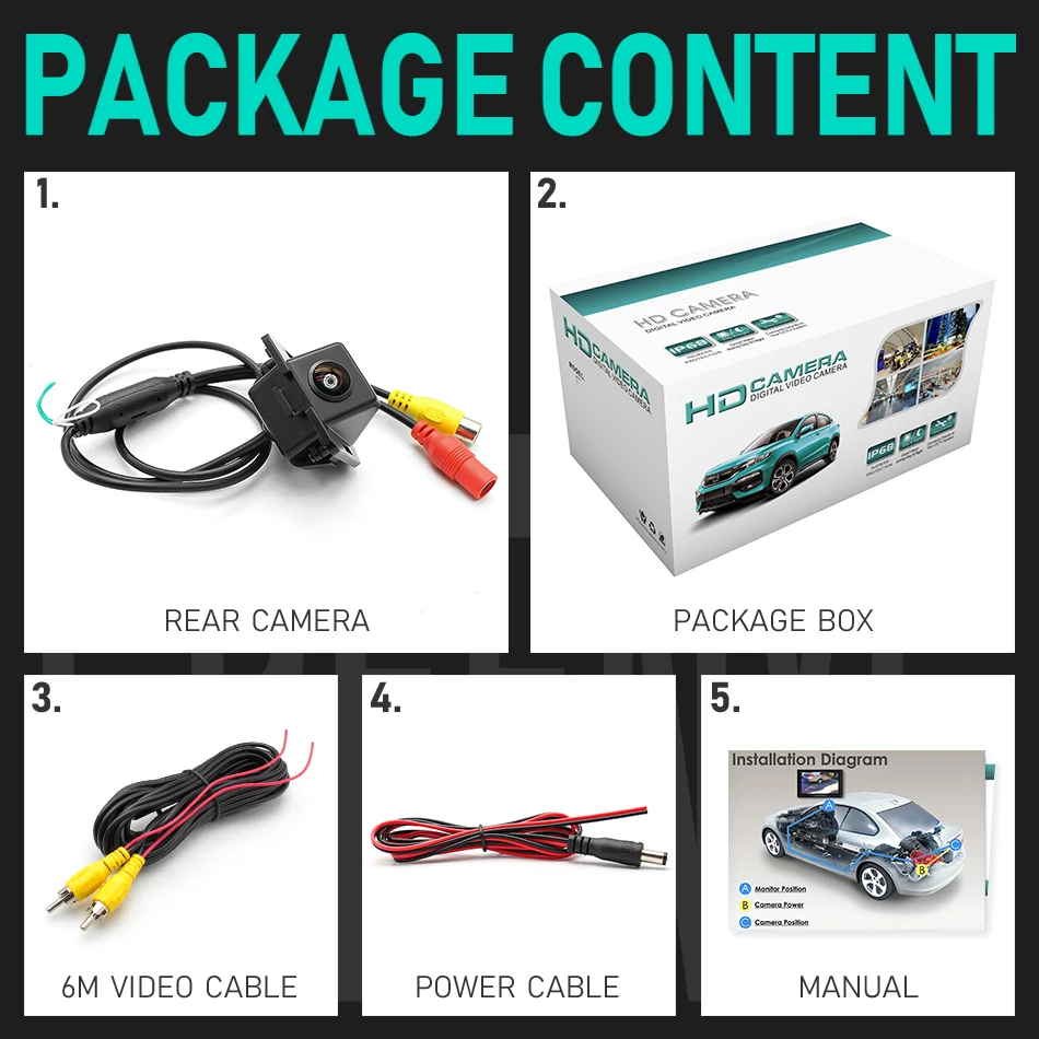 1. Задняя камера2. Коробка для посылка3. Видео кабель (6 м)4. Кабель питания5. Руководство пользователя