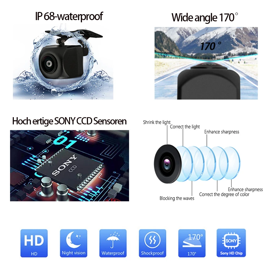 Все камеры будут протестированы перед отправкой вамДатчики изображения: CCD full HD Водонепроницаемая камера ночного виденияТВ система: NTSC и PALУгол объектива: 170Разрешение: 1080P * 720PЭлектронный затвор: 1/60 (NTSC) -1 / 10000s, 1/50 (PAL) -1 / 10000sКласс водонепроницаемости: IPX 68Рабочая температура: -20 ° C ~ + 80 ° C RH95 %Рабочая мощность (DCV): 12Потребление тока: 90 мА МаксО телевизионной системе камеры заднего вида автомобиля:Обычно большинство мониторов поддерживают ТВ-системы NTSC и PAL. Поэтому не имеет значения, является ли камера системой PAL или NTSC.Однако, если вы не уверены, пожалуйста, проверьте, поддерживает ли ваш монитор NTSC или PAL систему. Если ваш монитор поддерживает только NTSC или PAL, пожалуйста, оставьте нам сообщение о том, что нужно ТВ-системе в течение одного рабочего дня после оплаты. Или мы отправим NTSC или PAL системную камеру наугад.
