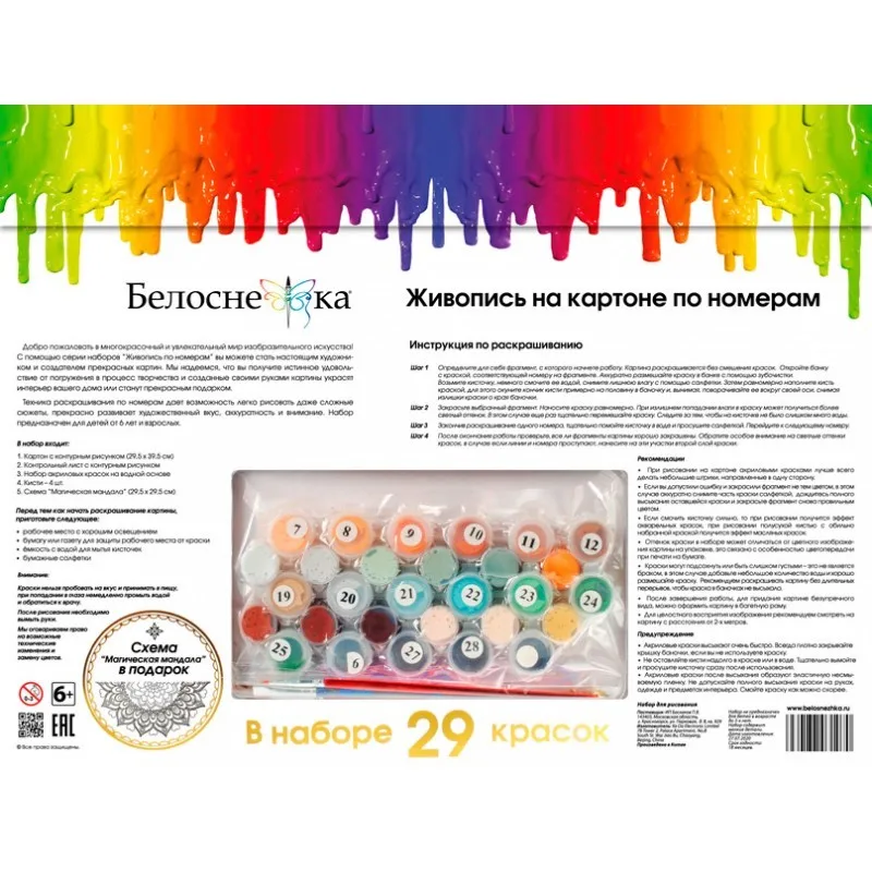 Не знаете, чем заняться в свои беззаботные дни отпуска, выходные или же каникулы? Белоснежка спешит порадовать вас и рассказать о таком увлекательном и полезном занятии, название которому – цифровое рисование!Цифрорисовашка устроена предельно просто: на основу из картона приклеена белая бумага, на которую нанесен рисунок, разбитый на пронумерованные сектора. Живопись по номерам комплектуется акриловыми красками на водной основе, которые не обладают резким и неприятным запахом, что, в первую очередь, гарантирует безопасность при использовании красок. С помощью них и вашей усидчивости результат непременно оправдает личные ожидания и заставит восхищаться любого.В наборах для цифрового творчества мы ориентируемся на достоверное воспроизведение оригинала, а это значит, что мы обеспечиваем использование авторских работ художников и качественную оцифровку изображения с мельчайшей детализацией.Экспериментируйте, творите, делитесь итогами и впечатлениями с нами!Комплектация:1. Картон с контурным рисунком2. Контрольный лист со схемой3. Набор акриловых красок на водной основе4. Кисти - 4 шт.5. Листовка о художнике6. Схема "Магическая мандала"- 1 шт.Характеристики:Художник – Юлия НеприятельСерия - животныеРазмер - 30*40 см.Тип красок - акриловые быстросохнущиеКоличество цветов - 29Упаковка - конверт из плотного картонаТорговая марка - БелоснежкаСтрана производства - Китай