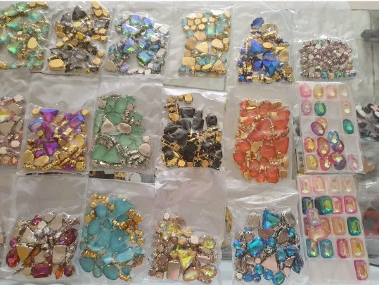 (Треугольник 18 мм, капля воды 13x18 мм, прямоугольник 13x18 мм, овал 13x18 мм, сердце 10 мм,Капля воды 8x13 мм, маркиз 7x15 мм, маркиз 4x15 мм, риволи 10 мм, квадрат 8 мм)10x2 шт. каждый.