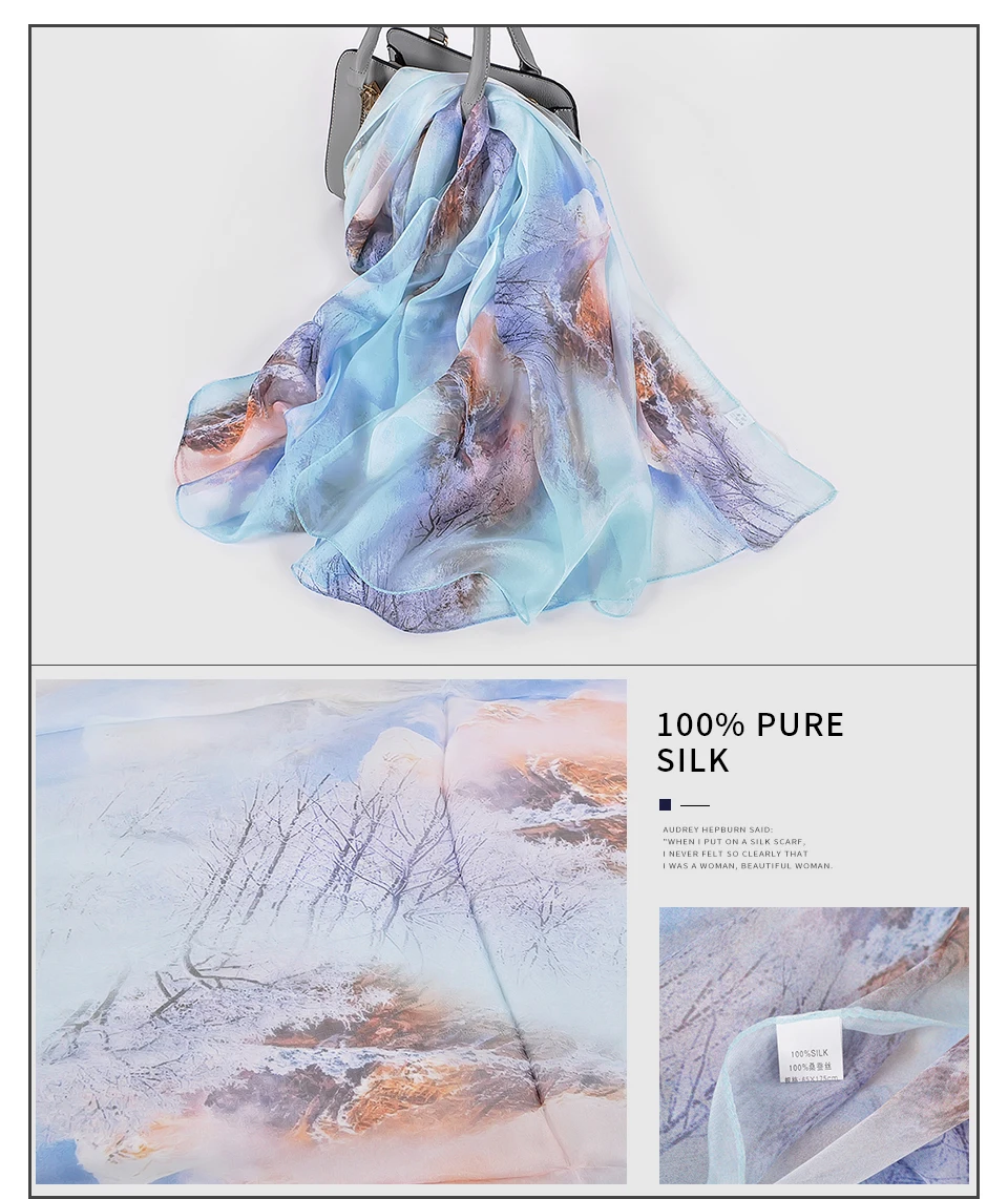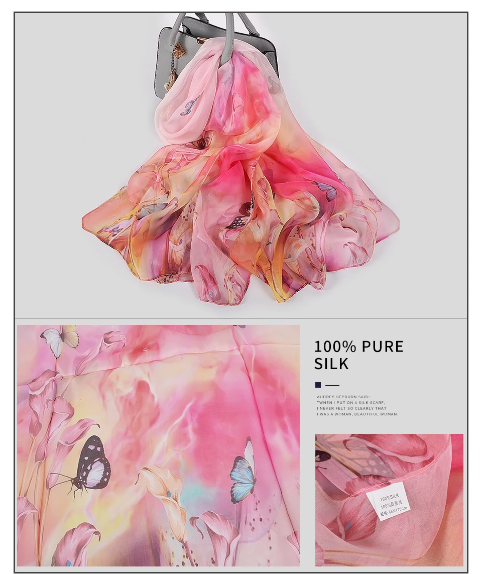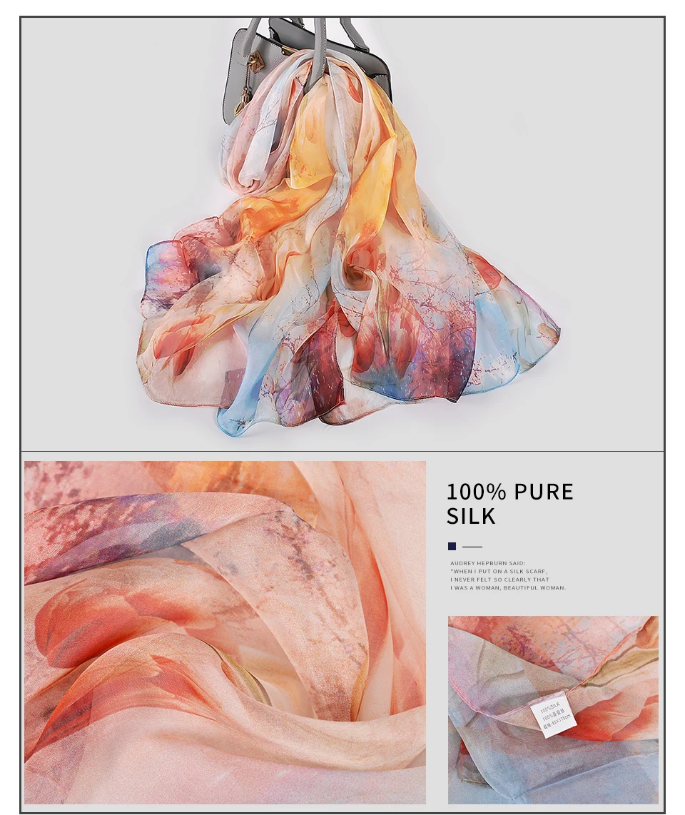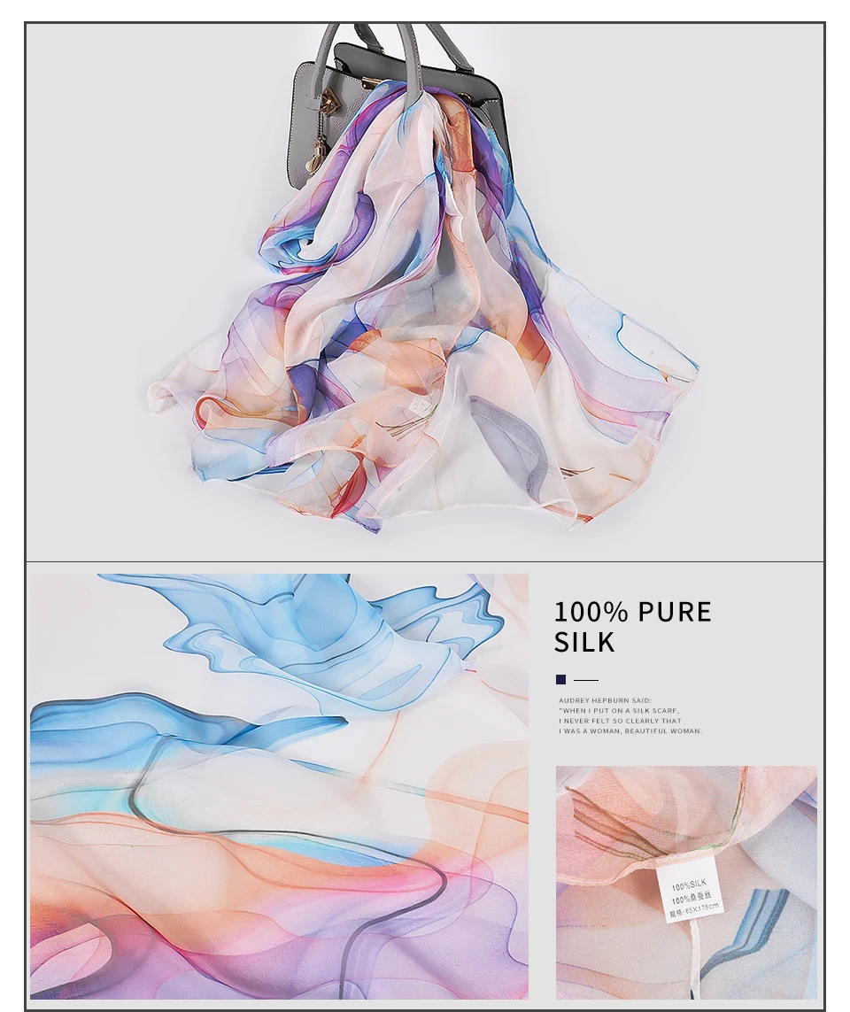 тонкий и приятный к телу шарфик. насчёт натуральности шелка не уверена, но очень скользкий. рисунок только по краям