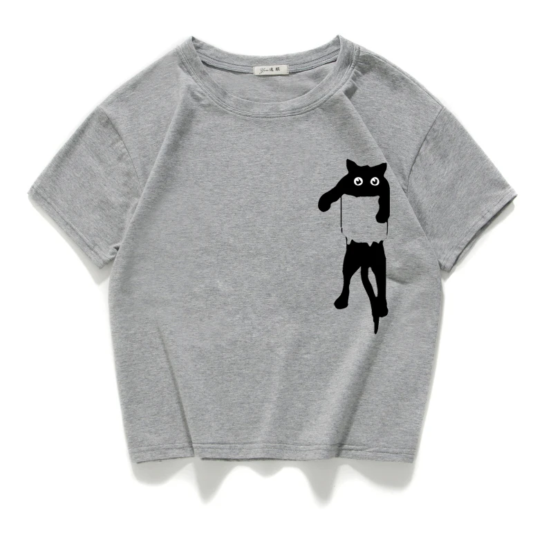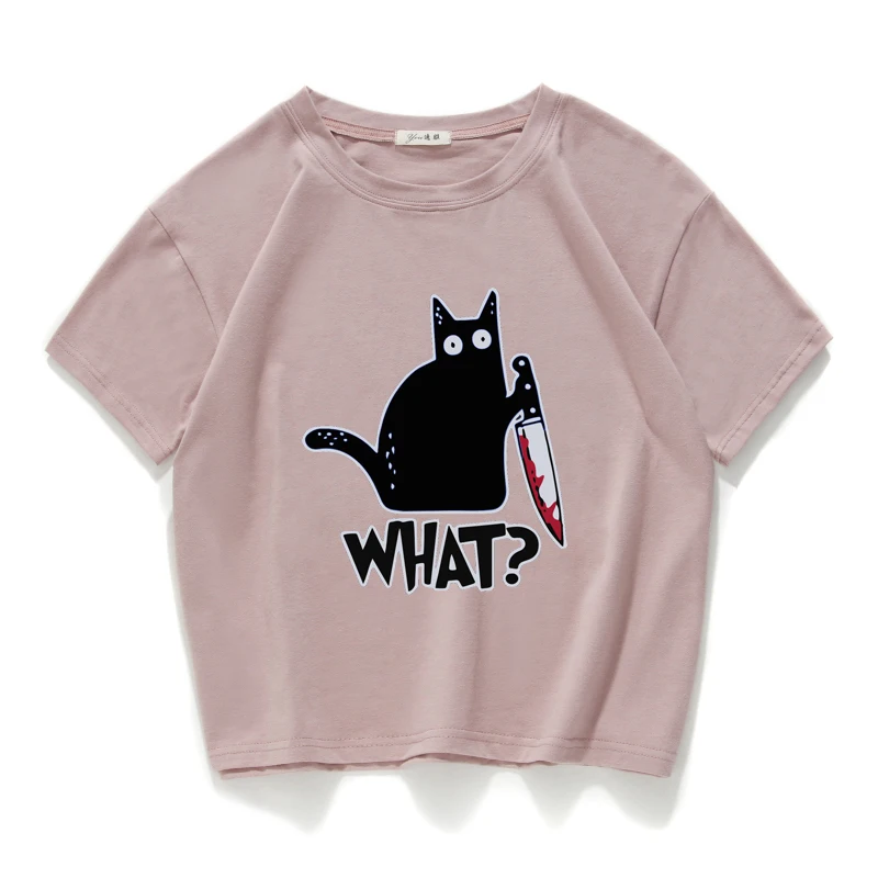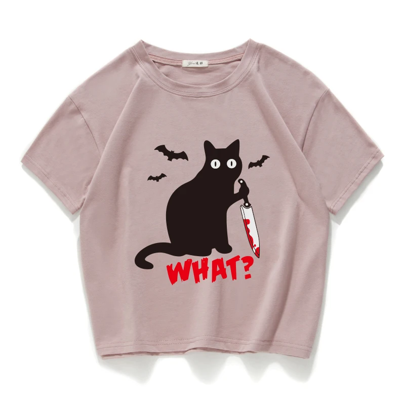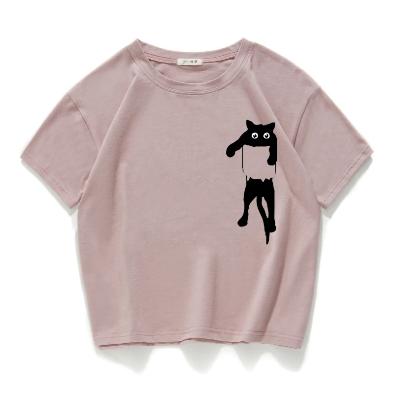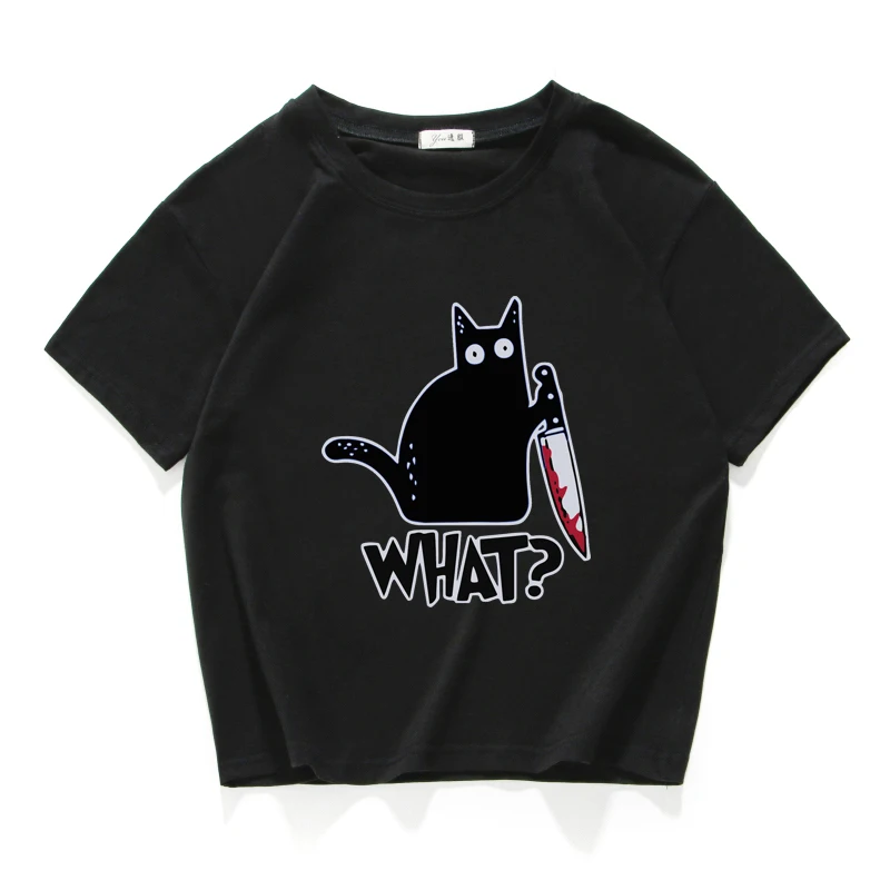 Кроп-топ с черной кошкой, забавная футболка с ножом-убийцей, женская футболка с карманом в виде кошки, топы, футболка, женская одежда, летние женские футболки