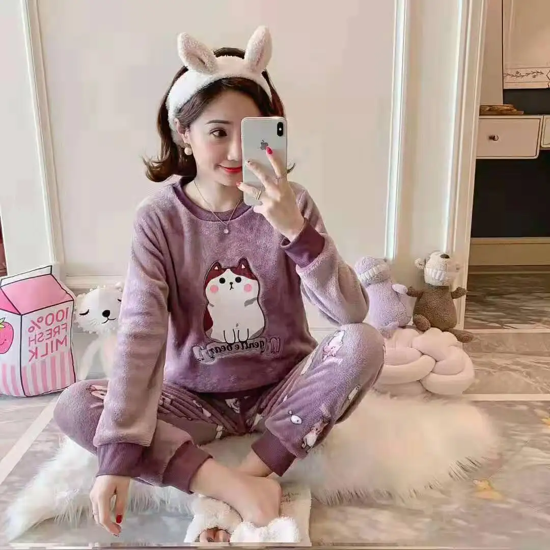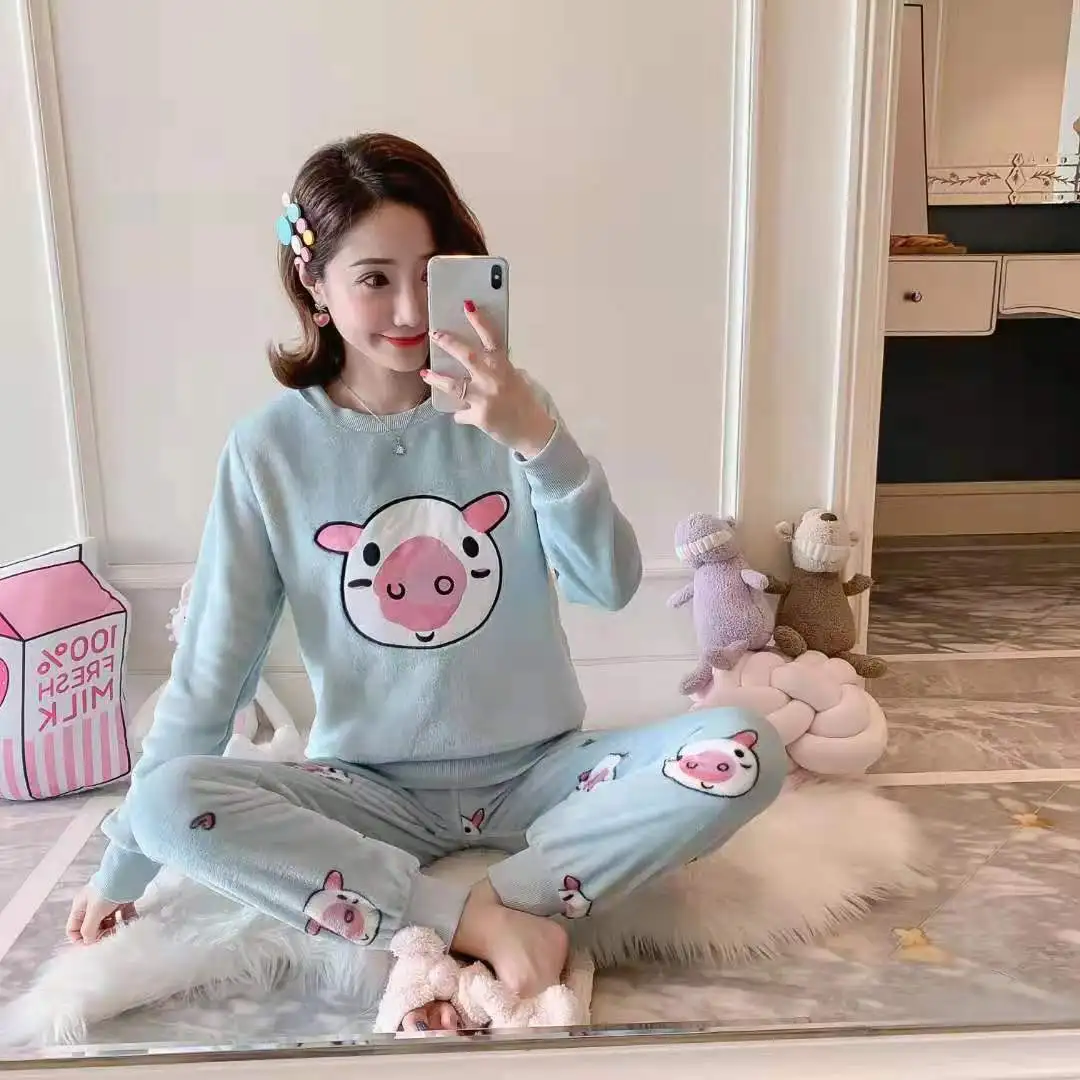 Осень-зима 2021, теплые фланелевые женские пижамные комплекты, плотная бархатная Пижама кораллового цвета с длинным рукавом, мультяшная одежда для сна, тонкий фланелевый пижамный комплект
