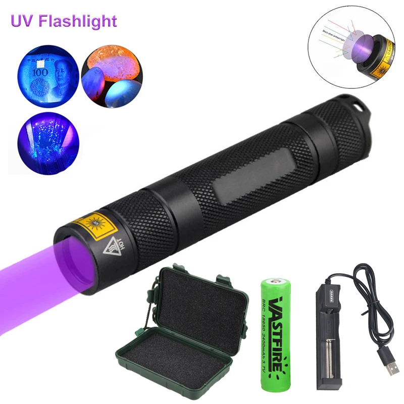 1 УФ светодиодный фонарикАккумулятор 18650-1 шт.1 зарядное устройство USB1 x коробка