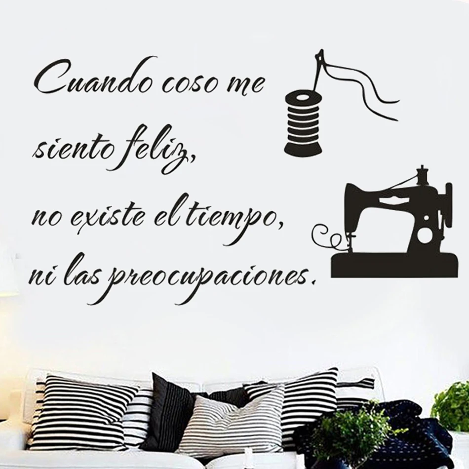 Испанские тексты для шитья, Виниловая наклейка, когда я пришиваю, я чувствую себя счастливым, цитата, настенная наклейка, украшение для магазина одежды, швейная машина, настенный постер RU114