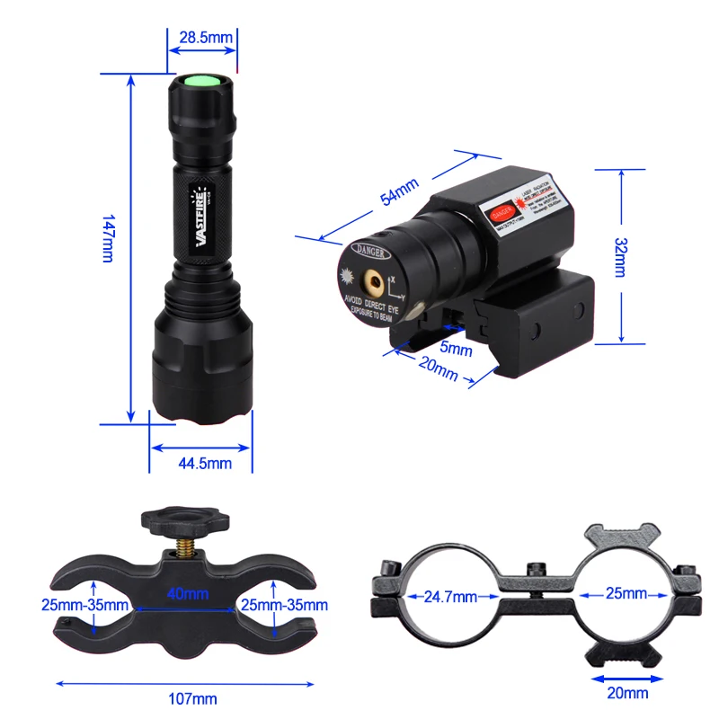 Посылка включает:1 х тактический светодиодный фонарик XM-L T61 х дистанционный переключатель давления1 x18650 аккумуляторная батареяЗарядное устройство-1 шт.1x Тактический красный лазерный луч точечный прицел набор1 х мини шестигранный гаечный ключ1 крепление для винтовки1x крепление