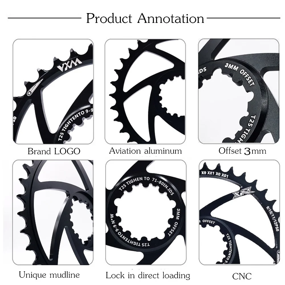 Параметры продукта: Бренд: VXM Материал: 7075-T6 авиационный алюминиевый сплав Цвет: черный Вес: 60 г/65 г/70 г/75 г/80 г Процесс: высокоскоростная гравировка и фрезерование с ЧПУ Количество зубов: 30T/32T/34T/36T/38T Офсетная печать: 3 мм Толщина: диск 7 мм ортодонтический 3,6 мм отрицательный зуб 2,0 мм Расширенный дизайн зуба Уникальная форма зуба предотвращает поломку цепи