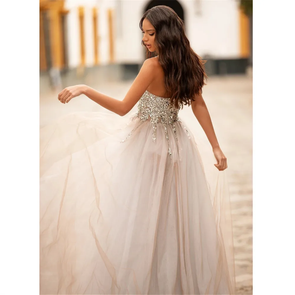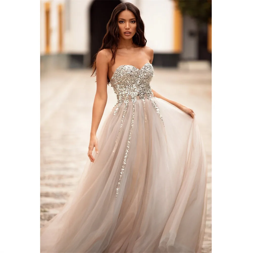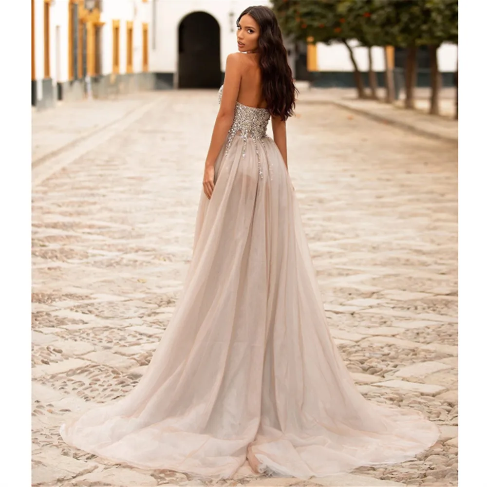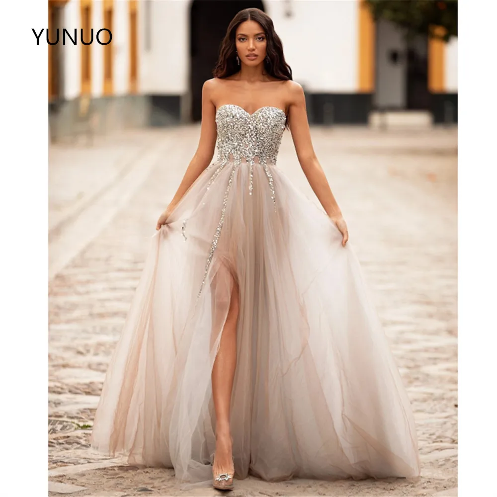 Женское вечернее платье YUNUO, длинное Тюлевое платье для выпускного вечера с серебряным бисером и разрезом сбоку, с открытой спиной