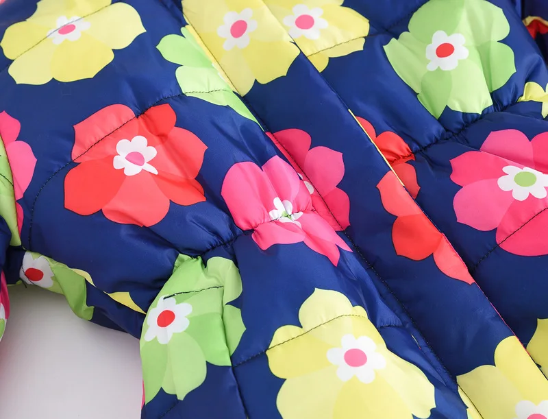 Новинка 2020, зимние детские пальто для мальчиков и девочек, длинный меховой воротник с мультяшным цветочным принтом и капюшоном, теплая хлопковая одежда