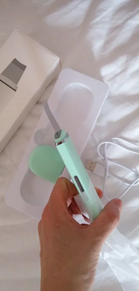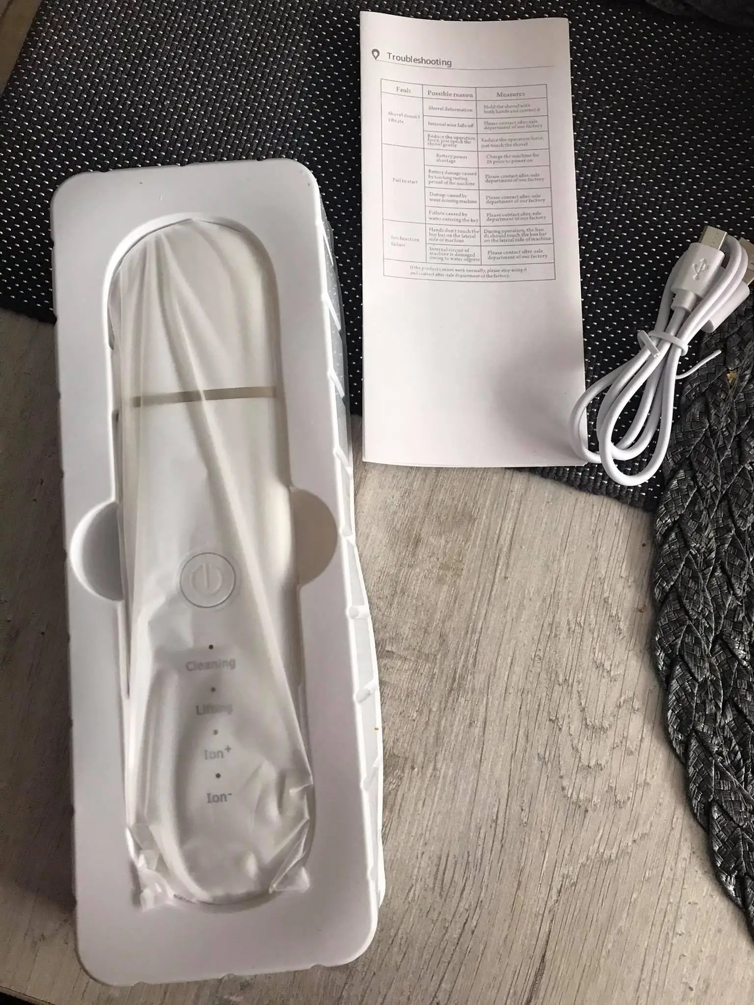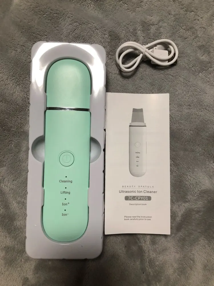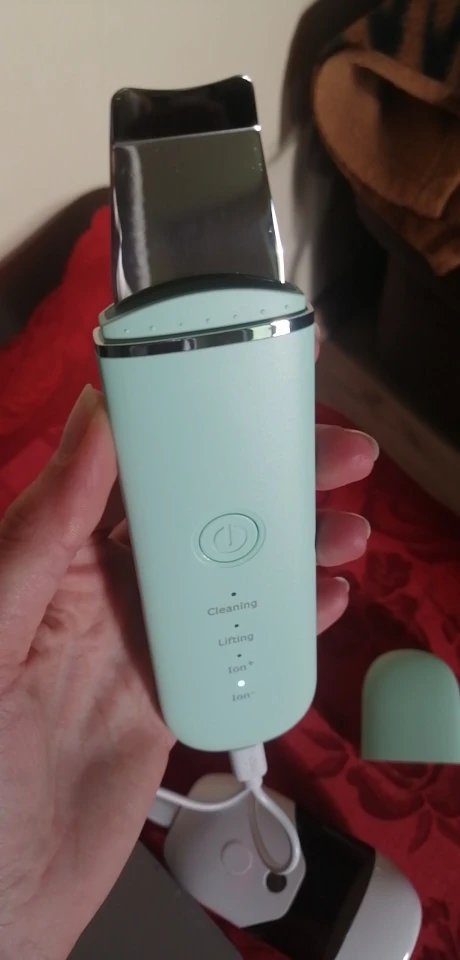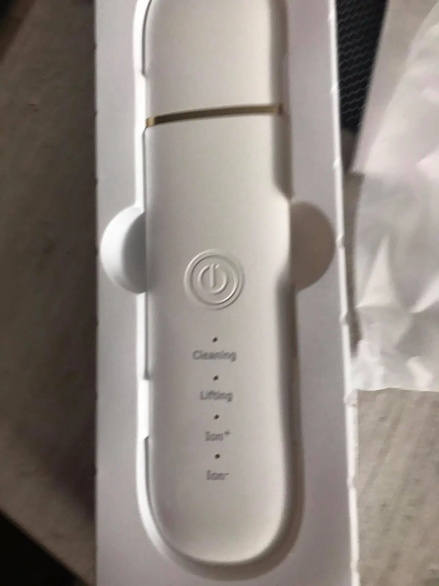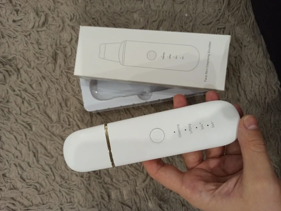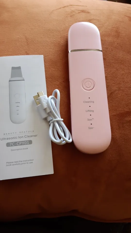 Внешне выглядит очень достойно.Металлическая лопатка не "тусклая",видно,что качество хорошее.Прибор пришёл заряженным.Включился долгим нажатием.Инструкция на английском есть,но автоперевод с телефона ни о чём.Ну,так всегда,поэтому надо смотреть на тубе.Но уже поняла-режимы легко переключаются одной основной кнопкой.Лицо пока не чистила,жду специальный гель для холодного распаривания.Но тактильно чувствуется ,что режимы разные.К покупке рекомендую.Спасибо,Али! Продавцу удачи и хороших продаж!