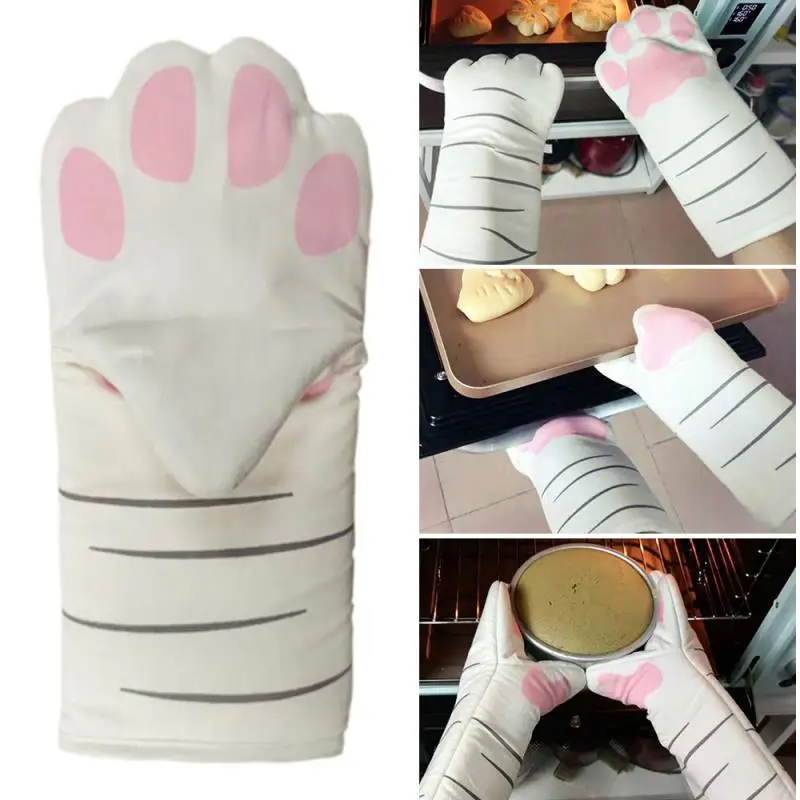 Длинные хлопковые термостойкие перчатки для выпечки с объемными мультяшными кошачьими лапами, противоскользящие кухонные перчатки