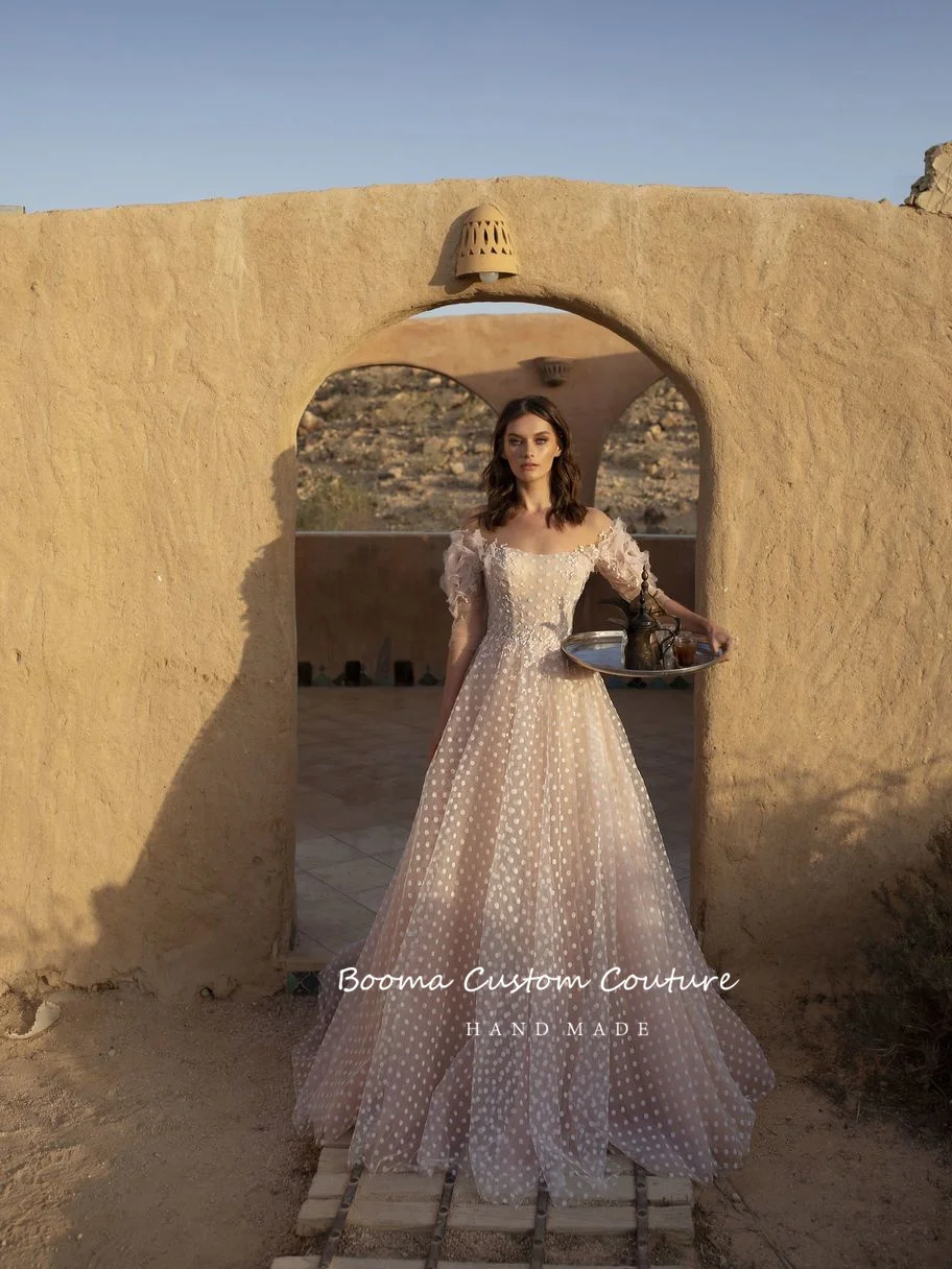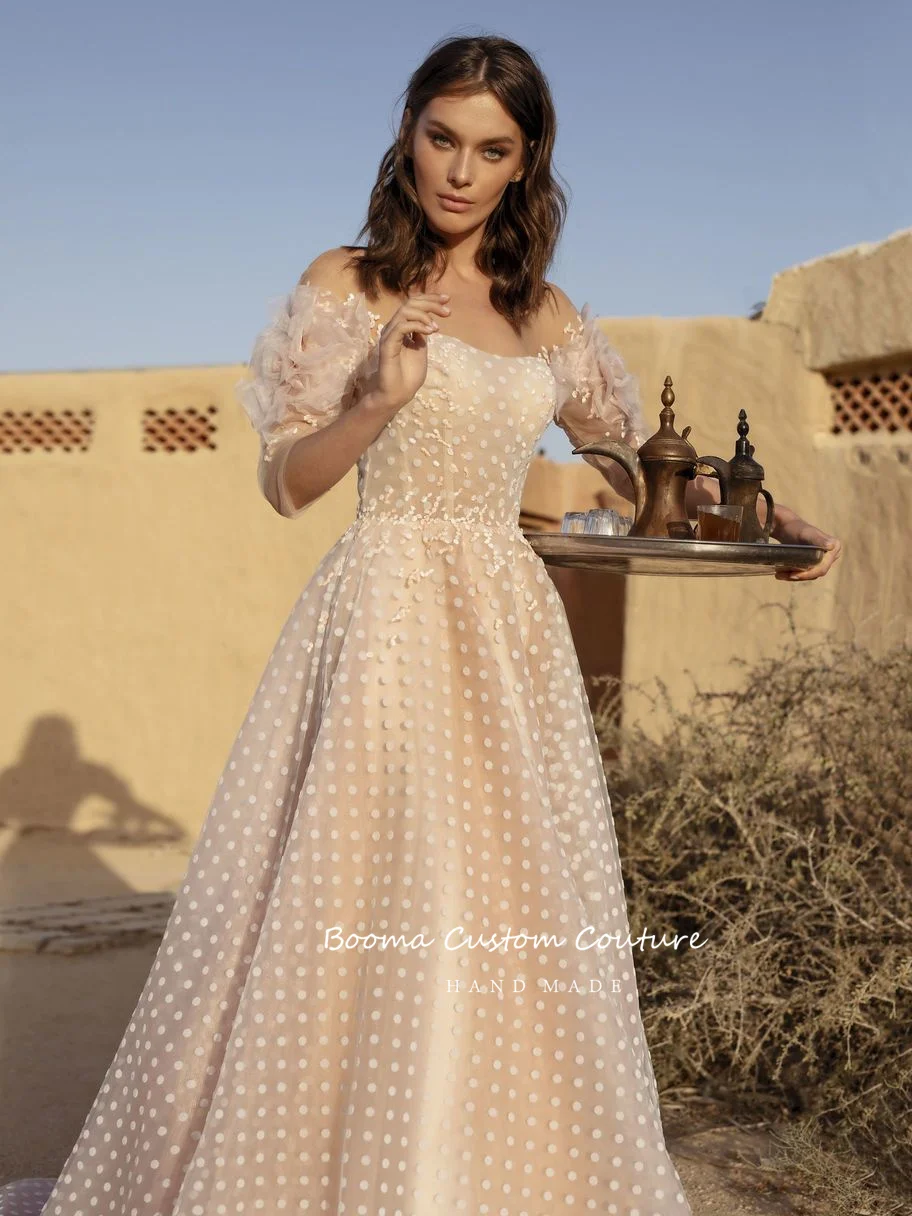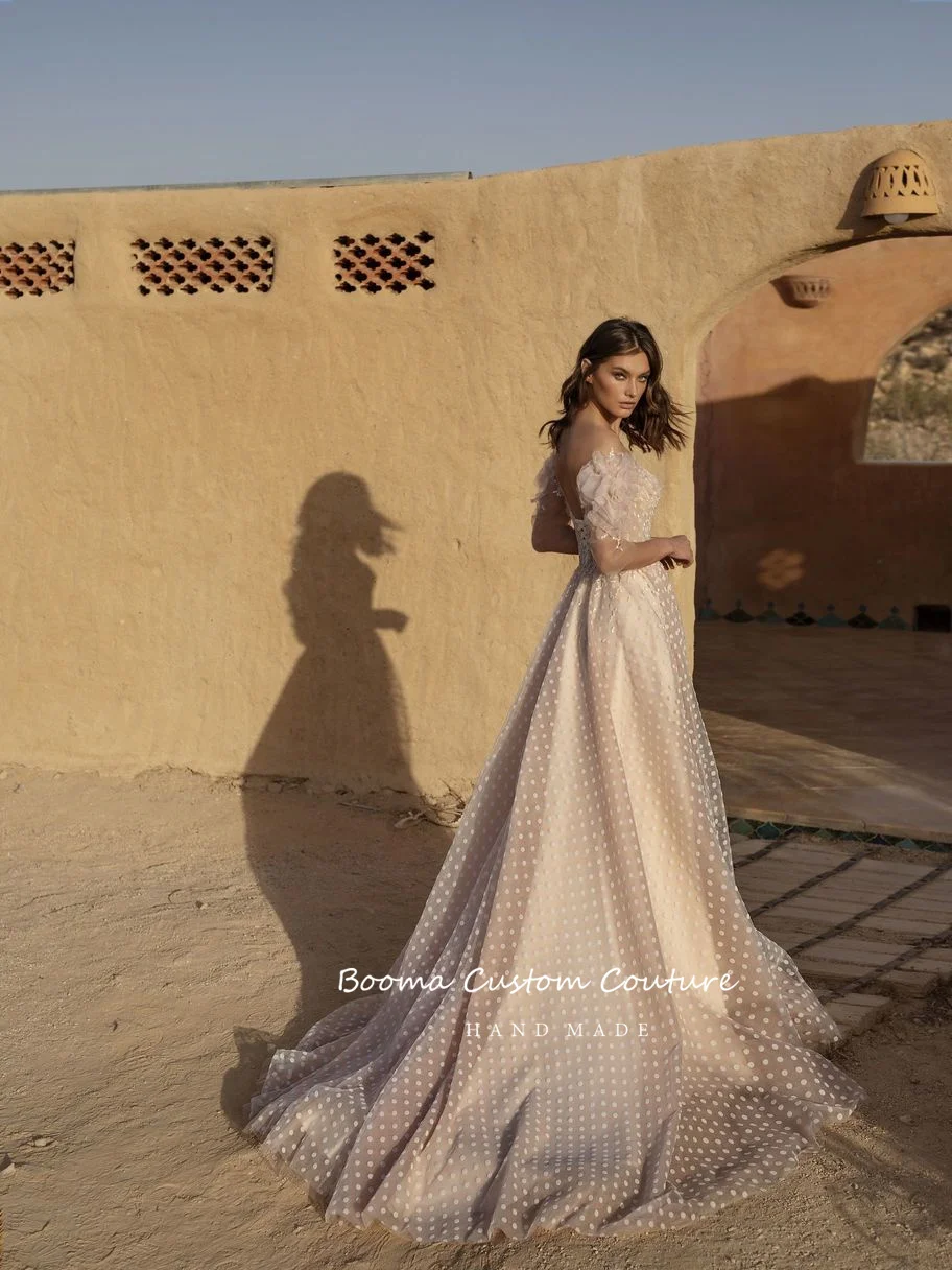 Тюлевое свадебное платье в горошек, без бретелек, с открытыми плечами, с коротким рукавом, длинное, ТРАПЕЦИЕВИДНОЕ, на шнуровке, 2020