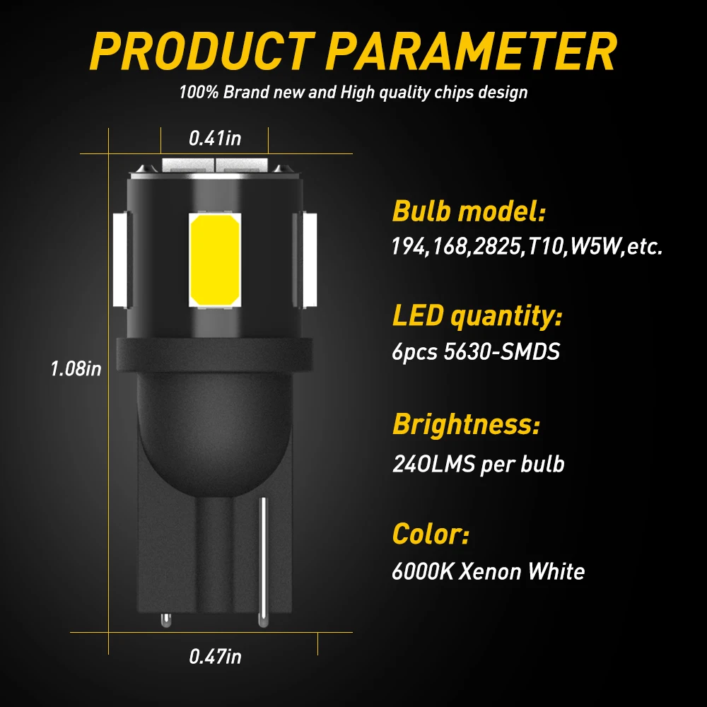 Вилка: T10 W5W 192 158 168 2825 147 175 152 158 159 161 168 184 192 193 901 904 и т. Д.Бусины лампы: 6 шт. 5630SMDНапряжение: 12-14 В постоянного токаТок: 0,06aМощность: 0,72 ВтПреимущество:1. Простота установки: маленький размерСветильник на 2,360 градусов3. Стабильная производительность, все алюминиевые детали, хорошая теплоотдача4. Высокая яркость: 3 раза Оригинальная Автомобильная галогенная лампа5. Нет электромагнитных помех