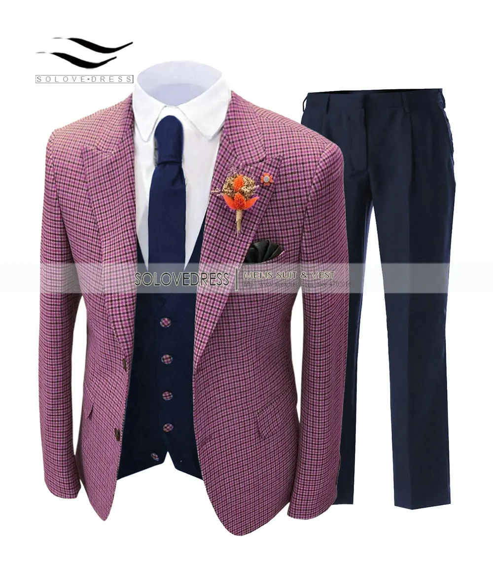 Деловые мужские костюмы стандартного кроя, Клетчатые Шерстяные твидовые смокинги для выпускного вечера, однотонный костюм из 3 предметов (Блейзер + жилет + брюки)