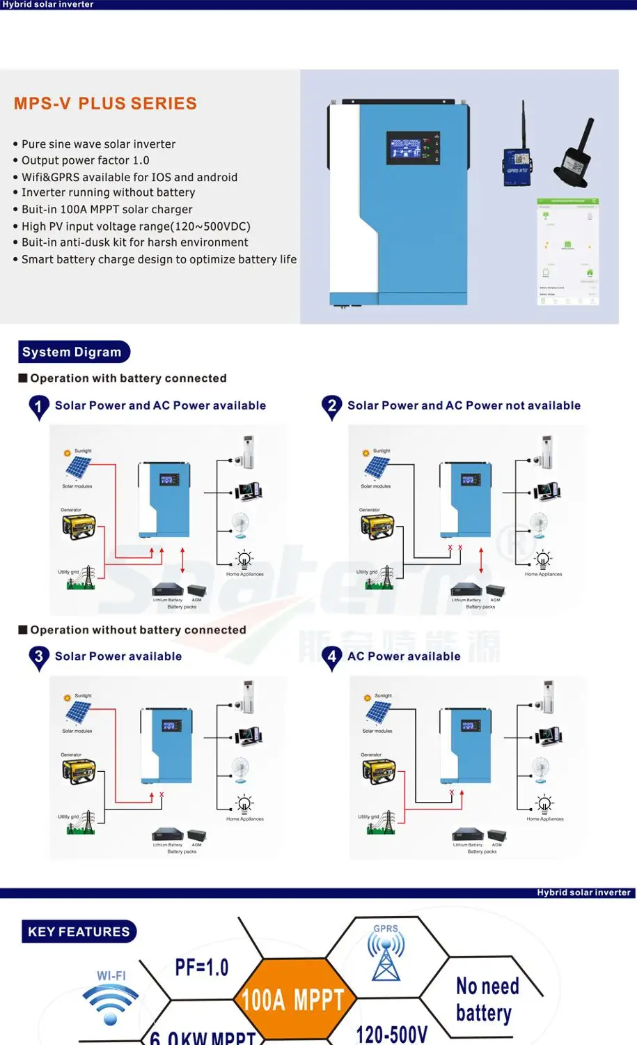 Гибридный инвертор PowMr, 3500 Вт, 24 В постоянного тока, MPPT, 100 А, 230 В переменного тока, 50 Гц60 Гц, автономное солнечное зарядное устройство, может работать без аккумулятора и с поддержкой Wi-Fi