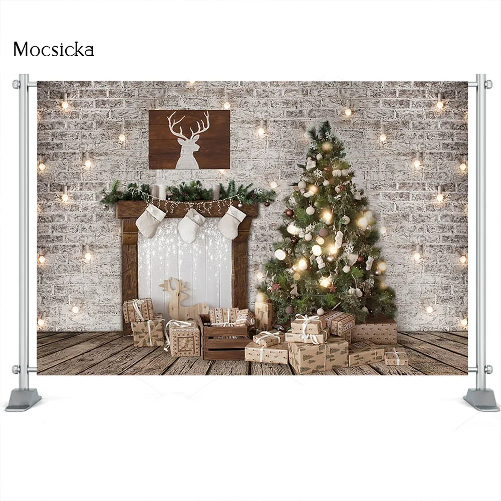 Рождественский фон кирпичный фон Стена камин Фотофон Рождественская елка картина подарки фонарик фон фотобудка