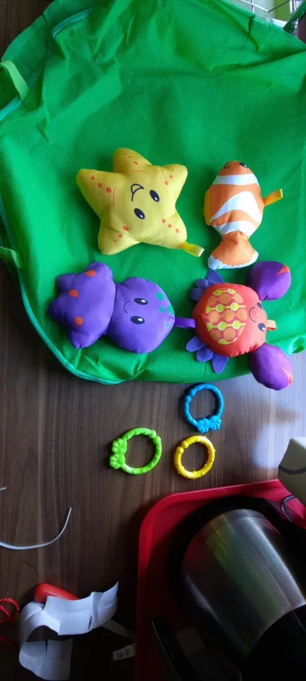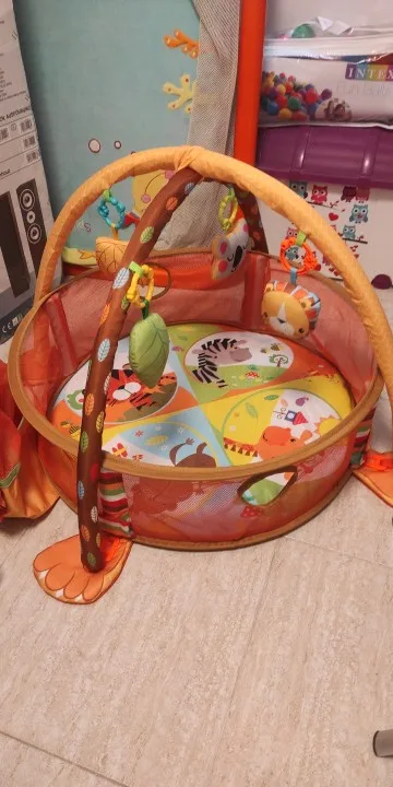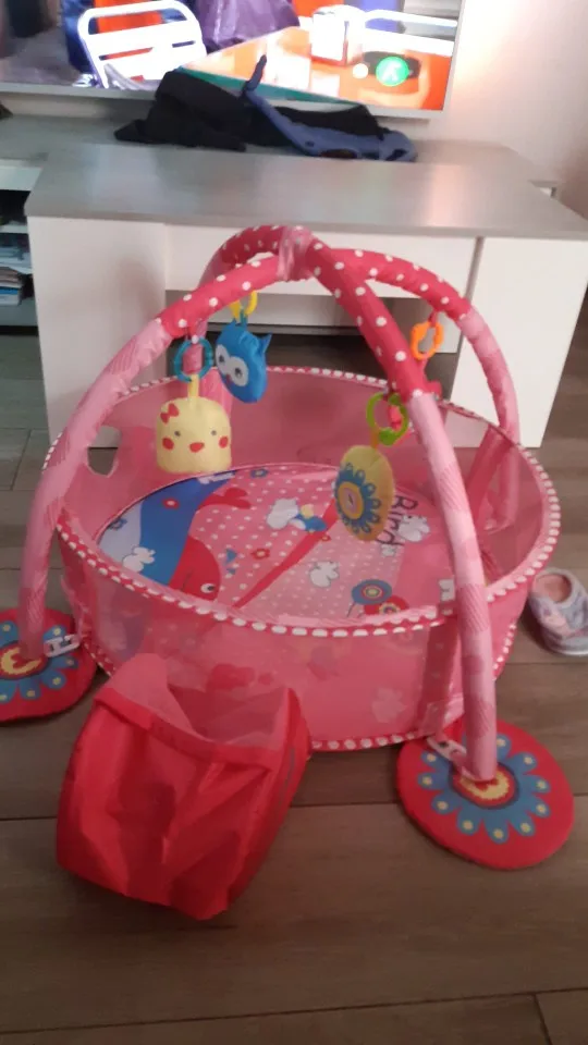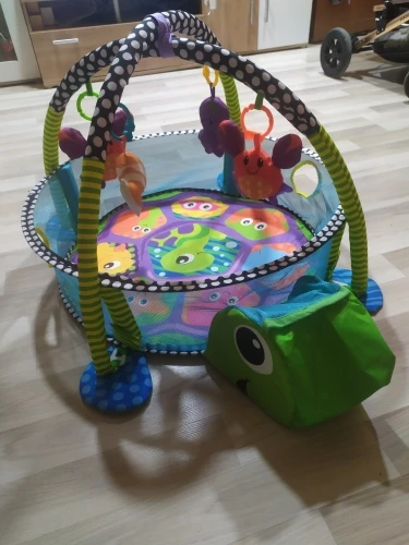 Развивающий коврик пришёл за 10 дней. Игрушки в комплекте,а шаров нет. Запаха нет. Пришёл в сумке куда удобно его складывать.