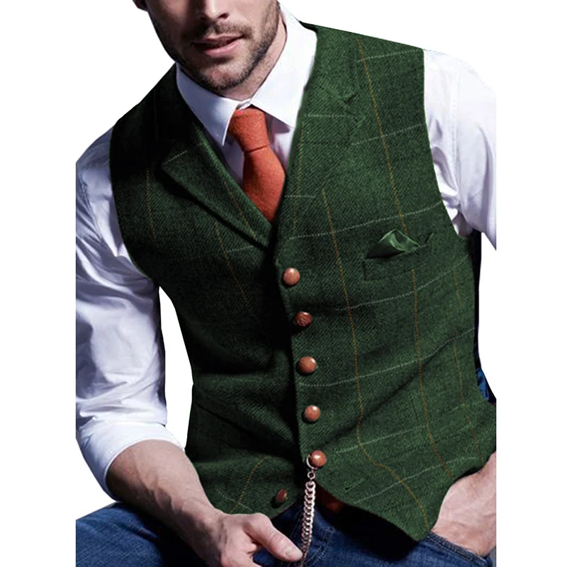 Мужской Клетчатый жилет, твидовый шерстяной жилет, приталенный клетчатый костюм с лацканами, жилет, повседневный жилет жениха, мужской жилет, зеленыйкоричневыйчерный