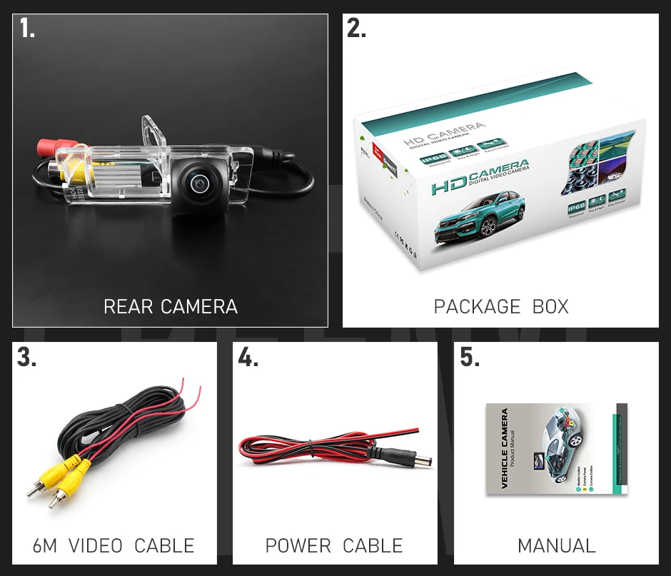 1. Задняя камера2. Коробка для посылка3. Видео кабель (6 м)4. Кабель питания5. Руководство пользователя