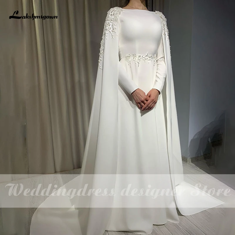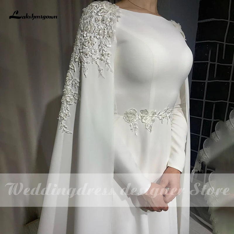 Арабское мусульманское свадебное платье с накидкой, трапециевидной формы, длинными рукавами, высокой горловиной, аппликацией со шлейфом, свадебное платье с кружевами