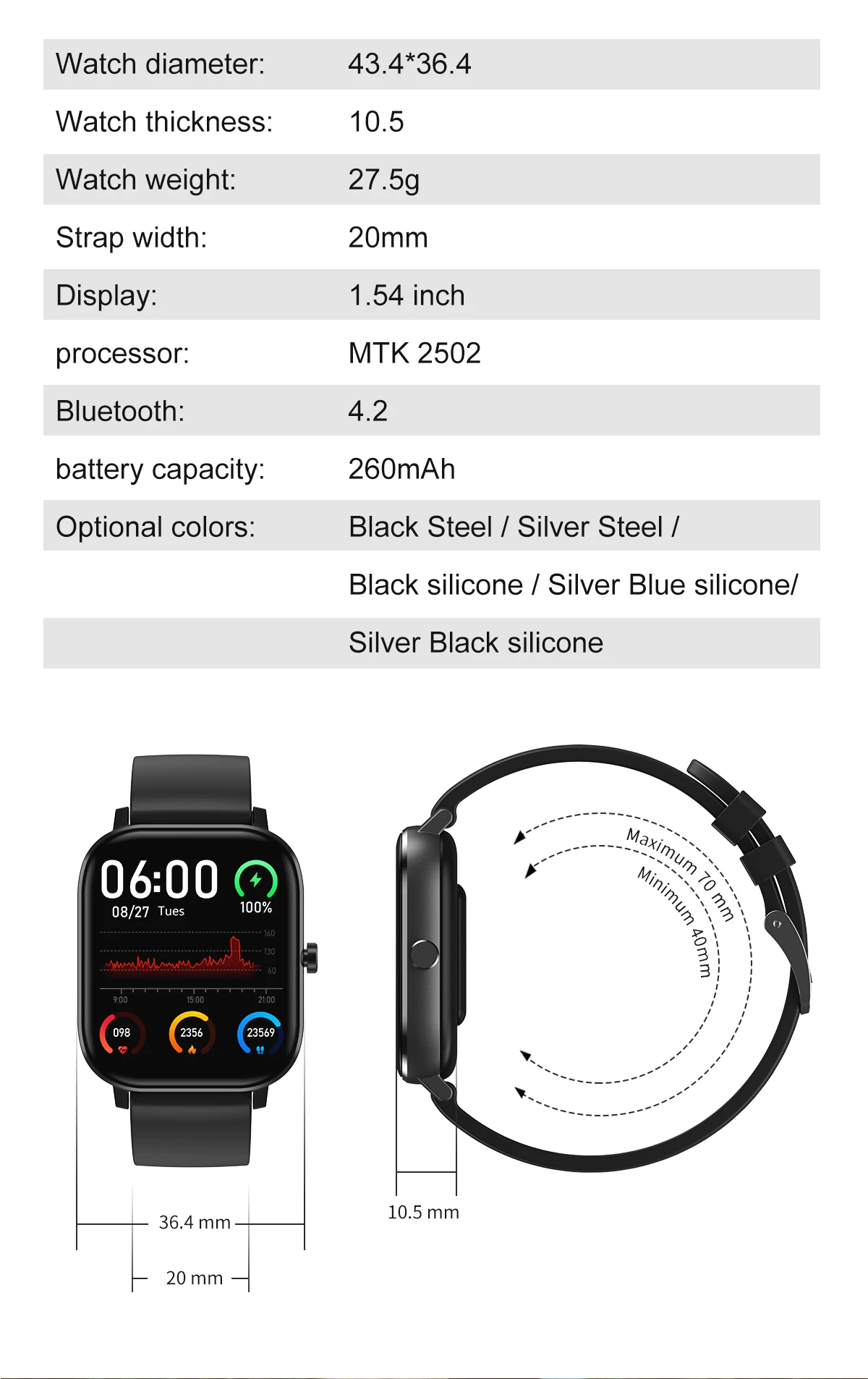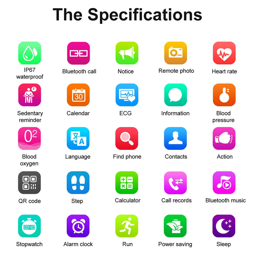Функция: Водонепроницаемость IP67, выбор 9 циферблатов, циферблат (вызов Bluetooth), телефонная книга, запись звонков, соединение Bluetooth, шаги, мониторинг сна, напоминание о сидячем положении, пульс, кровяное давление, кислород крови, музыка Bluetooth, удаленная фотография, поднимите руку, чтобы осветить, уведомления, калькулятор, будильник, календарь, секундомер, многоязычное приложение язык: русский, немецкий, итальянский, японский, французский, упрощенный китайский, английский, португальский, испанский язык устройства: английский, немецкий, русский, португальский, Испанский, итальянский турецкий чип: MTK 2502D RAM: встроенный процессор: RAM:32MB ROM32MB водонепроницаемый: IP67 Размер экрана: 1.54 Разрешение экрана: 240*240 Тип экрана: LTPS LCD материал экрана: закаленное стекло