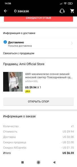 Очень красивая водолазка. Цвет темнее, чем на фото продавца. На рос. 46 размер XL сидит чуть менее свободно, чем на модели. Заказала 4 вещи 11.11.,а потом стоит "отмена транспортировки". Связалась с продавцом и предложила сделать новый заказ на те же вещи, но не оплачивать по полной стоимости. Продавец сразу согласился. Оформила заказ, но оплачивать не стала, прислала номер продавецу и он изменил сумму заказа на 0,75 рублей. После этого оплатила и все быстро дошло. Не спешите отменять заказы, а попробуйте сначала решить проблему, продавец очень хороший и порядочный!