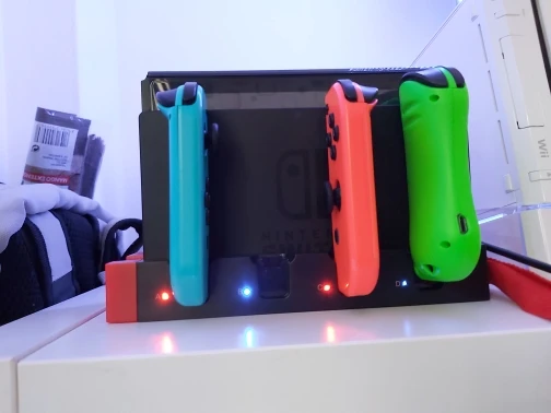 La estación de carga evita que puedas colocar la consola con Joy-Cons en sus costados y las luces de carga azules son muy potentes.