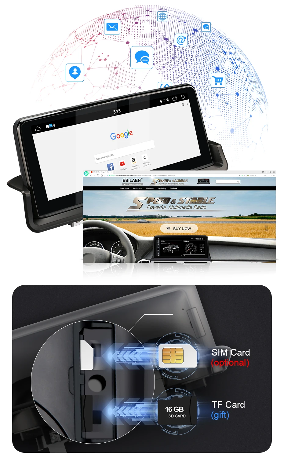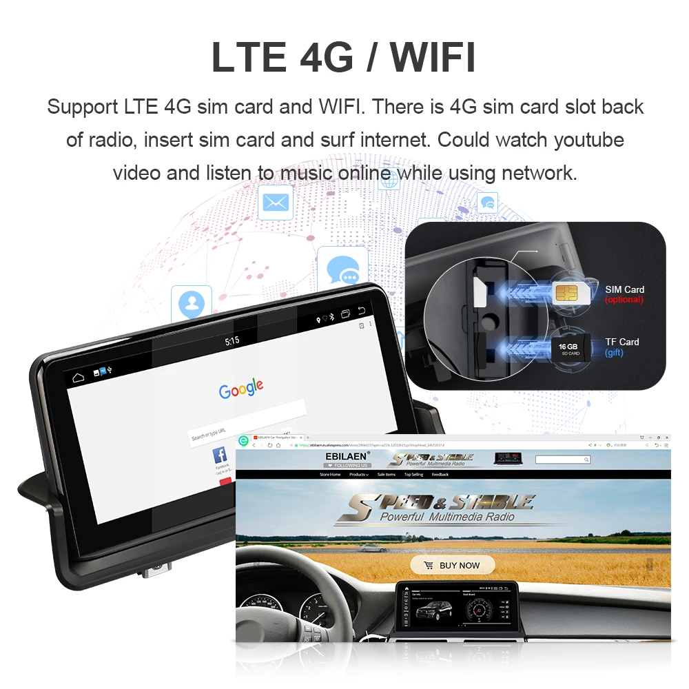 >>> Поддержка LTE 4G и WIFI, есть слот для сим-карты 4G на задней панели радио. Вставьте сим-карту и пользуйтесь интернетом. Можно смотреть видео на YouTube и слушать musci онлайн при использовании сети. Сим-карта 4G не является обязательной, вы можете купить сим-карту на местном рынке.